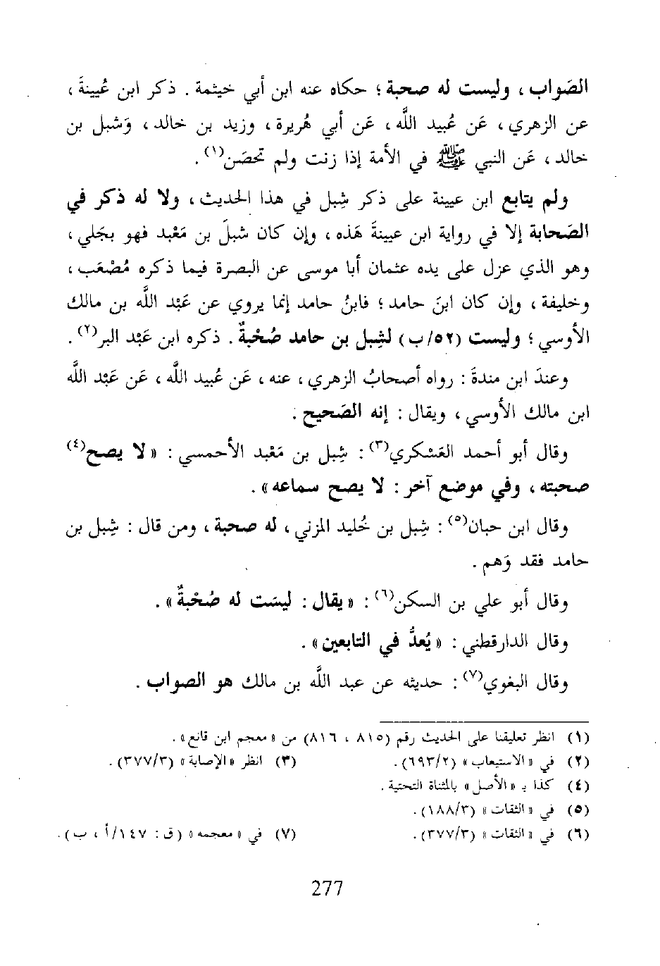 ولم يتابع ابن عيينة على ذكر شِبل فِي هذا الحديث، ولا له ذكر فِي الصَّحابة إلا فِي رواية ابن عيينةَ هَذه، وإن كان شبلَ بن مَعْبد فهو بجَلي، وهو الَّذي عزل على يده عثمان أبا موسى عن البصرة فيما ذكره مُصْعَب، وخليفة، وإن كان ابنَ حامد؛ فابنُ حامد إنما يروي عن عَبْد الله بن مالك الأوسي، وليست لشبل بن حامد صُحْبةٌ. ذكره ابن عَبْد البر (٢).
