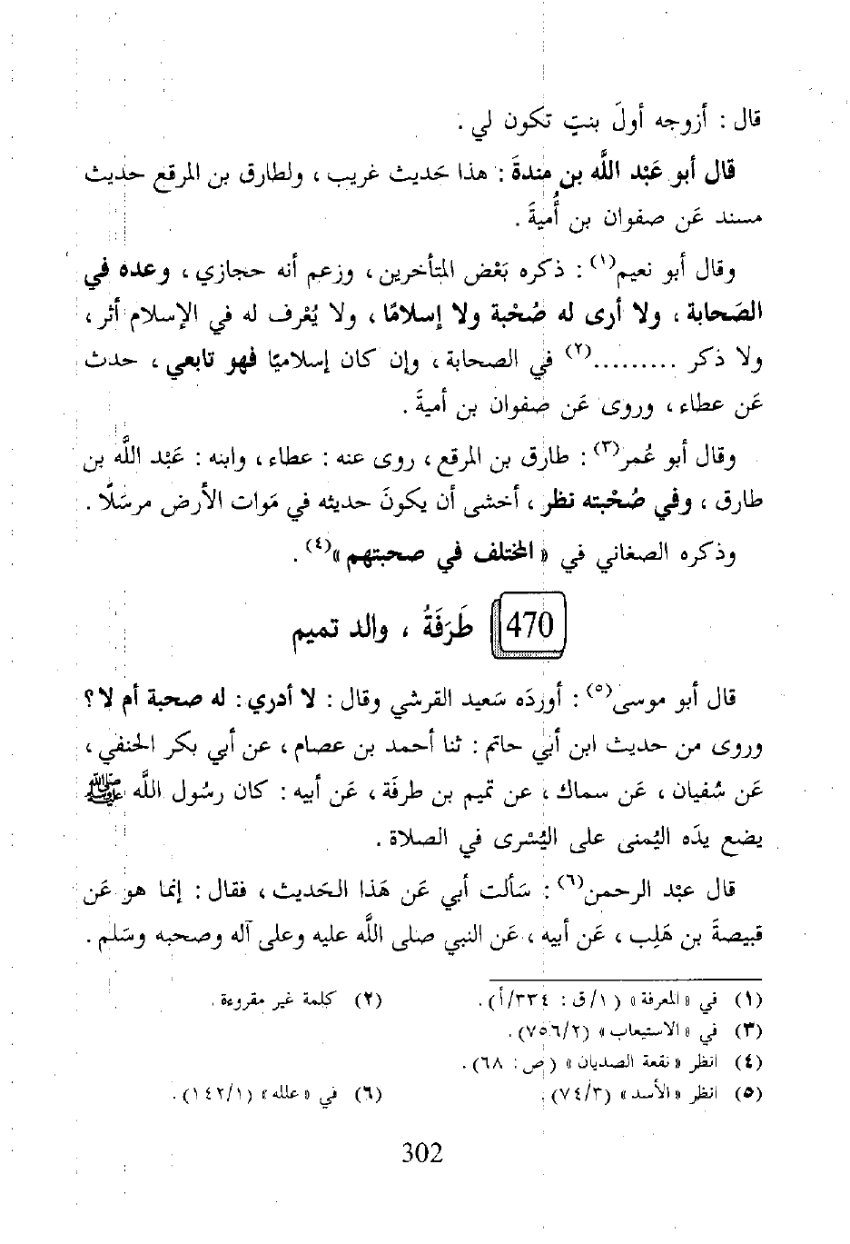 قال أبو موسى (٥): أوردَه سَعيد القرشي وقال: لا أدري: له صحبة أم لا؟ وروى من حديث ابن أبي حاتم: ثنا أحمد بن عصام، عن أبي بكر الحنفي، عَن سُفيان، عَن سماك، عن تميم بن طرفَة، عَن أبيه: كان رسُول الله - صلى الله عليه وسلم - يضع يدَه اليُمنى على اليُسْرى في الصلاة.