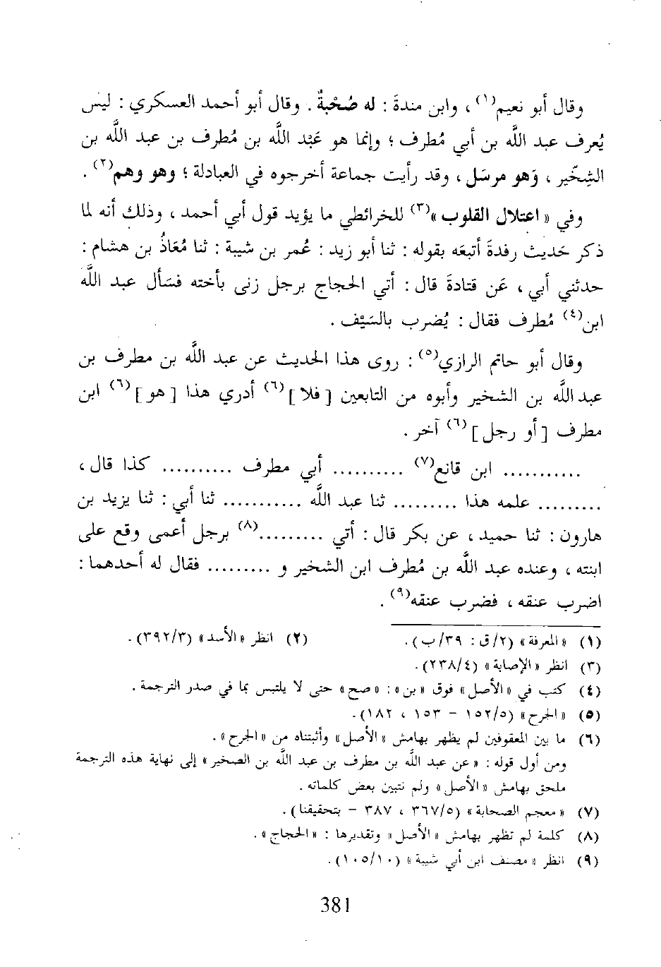 . . .. ابن قانع (٧). . . أبي مطرف. . . كذا قال، . . . علمه هذا. . . ثنا عبد الله. . ... ثنا أبي: ثنا يزيد بن هارون: ثنا حميد، عن بكر قال: أتي. ... (٨) برحل أعمى وقع على ابنته، وعنده عبد الله بن مطرف ابن الشخير و. . فقال له أحدهما: اضرب عنقه، فضرب عنقه (٩).