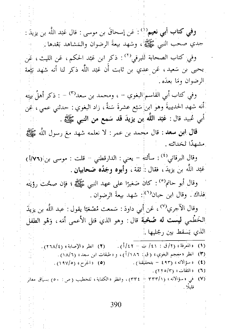 وفي كتاب أبي القاسم البغوي-، ومحمد بن سعد (٣) -: ذكر أهلُ بيته أنه شهد الحديبيةَ وهو ابن سَبع عشرةَ سنةً، زاد البغوي: حدثني عمي، عَن أبي عُبيد قال: عَبْد الله بن يزيدَ قد سَمع من النبي - صلى الله عليه وسلم -.