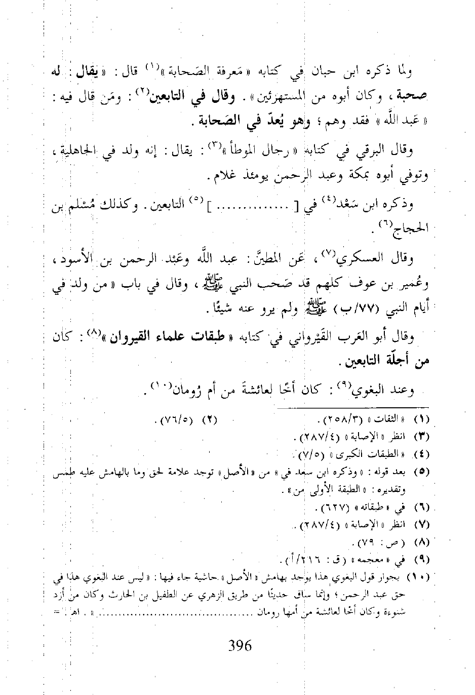 (١٠) بجوار قول البغوي هذا يوجد بهامش "الأصل" حاشية جاء فيه: "ليس عند البغوي هذا في حق عبد الرحمن؛ وإنما ساق حديثًا من طريق الزهري عن الطفيل بن الحارث وكان من أزد شنوءة وكان أخًا لعائشة من أمها رومان. . . . . . " أ. هـ =
