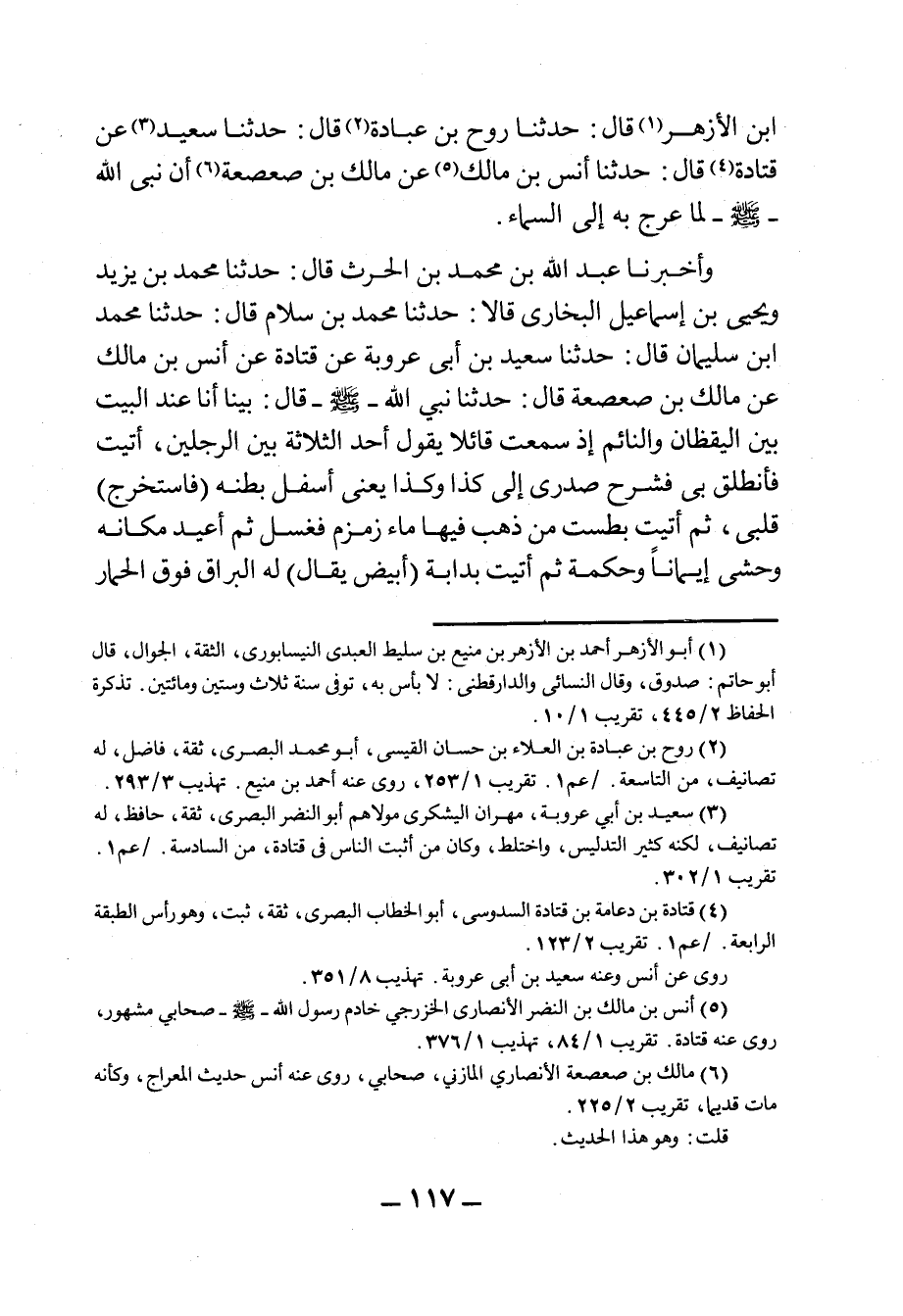 ثُمَّ أُتِيتُ بِدَابَّةٍ أَبْيَضُ يُقَالُ لهُ: البُرَاقُ، فَوْقَ الحِمَارِ وَدُونَ البَغْلِ يَقْطَعُ خَطْوَهُ عِنْدَ أَقْصَى طَرْفِهِ؛ فَحُمِلْتُ عَلَيْهِ، ثُمَّ انْطَلَقْنَا حَتَّى أَتَيْنَا السَّمَاءَ الدُّنْيَا، فَاسْتَفْتَحَ جِبْرِيلُ، عَلَيْهِ السَّلَامُ، وَقِيلَ: مَنْ هَذَا؟ قَالَ: جِبْرِيلُ، قِيلَ: وَمَنْ مَعَكَ؟ قَالَ: مُحَمَّدٌ قَالَ: فَفُتِحَ لنَا البَابُ، وَقَالُوا: مَرْحَبًا بِهِ، وَلَنِعْمَ المَجِيءُ جَاءَ، ثُمَّ أَتَيْتُ عَلَى آدَمَ؛ فَقُلْتُ: يَا جِبْرِيلُ مَنْ هَذَا؟ قَالَ: هَذَا أَبُوكَ آدَمُ، فَسَلَّمْتُ عَلَيْهِ فَقَالَ: مَرْحَبًا بِالابْنِ الصَّالِحِ وَالنَّبِيِّ الصَّالِحِ، ثُمَّ انْطَلَقْنَا حَتَّى أَتَيْنَا السَّمَاءَ الثَّانِيَةَ، فَاسْتَفْتَحَ جِبْرِيلُ، قِيلَ: مَنْ هَذَا؟ قَالَ: جِبْرِيلُ، قِيلَ: وَمَنْ مَعَكَ؟ قَالَ: مُحَمَّدٌ، فَفُتِحَ لنَا، وَقَالُوا: مَرْحَبًا بِهِ وَلَنِعْمَ المَجِيءُ جَاءَ، فَأَتَيْتُ عَلَى عِيسَى وَيَحْيَى، عَلَيْهِمَا السَّلَامُ، فَقُلْتُ: يَا جِبْرِيلُ مَنْ هَذَانِ؟ قَالَ: هَذَانِ عِيسَى وَيَحْيَى، قَالَ سَعِيدٌ: أَحْسِبُهُ قَالَ: ابْنَا الخَالَةِ. قَالَ: فَسَلَّمْتُ عَلَيْهِمَا؛ فَقَالَا: مَرْحَبًا بِالأَخِ الصَّالِحِ وَالنَّبِيِّ الصَّالِحِ، ثُمَّ انْطَلَقْنَا حَتَّى أَتَيْنَا السَّمَاءَ الثَّالِثَةَ؛ فَكَانَ مِثْلُ قَوْلِهِمْ، فَأَتَيْتُ عَلَى يُوسُفَ، عَلَيْهِ السَّلَامُ، فَسَلَّمْتُ عَلَيْهِ؛ فَقَالَ: مَرْحَبًا بِالأَخِ الصَّالِحِ وَالنَّبِيِّ الصَّالِحِ، ثُمَّ انْطَلَقْنَا حَتَّى أَتَيْنَا السَّمَاءَ الرَّابِعَةَ، فَأَتَيْنَا عَلَى إِدْرِيسَ، عَلَيْهِ السَّلَامُ، فَسَلَّمْتُ عَلَيْهِ؛ فَقَالَ: مَرْحَبًا بِالأَخِ الصَّالِحِ وَالنَّبِيِّ الصَّالِحِ، ثُمَّ انْطَلَقْنَا حَتَّى أَتَيْنَا السَّمَاءَ الخَامِسَةَ فَأَتَيْتُ عَلَى هَارُونَ، عَلَيْهِ السَّلَامُ، فَسَلَّمْتُ عَلَيْهِ؛ فَقَالَ: مَرْحَبًا بِالأَخِ الصَّالِحِ وَالنَّبِيِّ الصَّالِحِ، ثُمَّ انْطَلَقْنَا حَتَّى أَتَيْنَا السَّمَاءَ السَّادِسَةَ، فَأَتَيْتُ عَلَى مُوسَى، عَلَيْهِ السَّلَامُ، فَسَلَّمْتُ عَلَيْهِ؛ فَقَالَ: مَرْحَبًا بِالأَخِ الصَّالِحِ وَالنَّبِيِّ الصَّالِحِ، فَلَمَّا جَاوَزْتُهُ بَكَى، فَنُودِيَ: مَا يُبْكِيكَ؟ فَقَالَ: يَا رَبِّ هَذَا غُلَامٌ بَعَثْتَهُ بَعْدِي تُدْخِلُ مِنْ أُمَّتِهِ الجَنَّةَ أَكْثَرَ مِمَّا تُدْخِلُ مِنْ أُمَّتِي، ثُمَّ انْطَلَقْنَا حَتَّى أَتَيْنَا السَّمَاءَ السَّابِعَةَ، فَاسْتَفْتَحَ جِبْرِيلُ عَلَيْهِ السَّلَامُ، فَقِيلَ: مَنْ هَذَا؟ قَالَ: جِبْرِيلُ، قِيلَ: وَمَنْ مَعَكَ؟ قَالَ: مُحَمَّدٌ، قِيلَ: وَقَدْ بُعِثَ إِلَيْهِ؟ قَالَ: نَعَمْ، فَفُتِحَ لنَا، وَقَالُوا: مَرْحَبًا بِهِ وَلَنِعْمَ المَجِيءُ جَاءَ، قَالَ سَعِيدُ بْنُ أَبِي عَرُوبَةَ: عِنْدَ كُلِّ سَمَاءٍ قِيلَ لهُمْ مِثْلُ هَذَا، يَعْنِي مِنَ اسْتِفْتَاحِ جِبْرِيلَ، عَلَيْهِ السَّلَامُ، وَمِنْ قَوْلِهِمْ لهُ،
