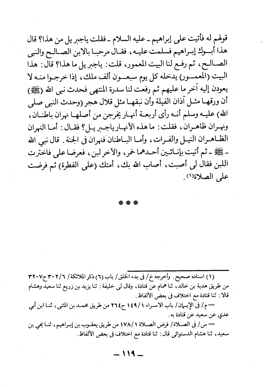 فَأَتَيْتُ عَلَى إِبْرَاهِيمَ، عَلَيْهِ السَّلَامُ، فَقُلْتُ: يَا جِبْرِيلُ مَنْ هَذَا؟ قَالَ: هَذَا أَبُوكَ إِبْرَاهِيمُ، فَسَلَّمْتُ عَلَيْهِ، فَقَالَ: مَرْحَبًا بِالابْنِ الصَّالِحِ وَالنَّبِيِّ الصَّالِحِ، ثُمَّ رُفِعَ لنَا البَيْتُ المَعْمُورُ، قُلْتُ: يَا جِبْرِيلُ مَا هَذَا؟ قَالَ: هَذَا البَيْتُ المَعْمُورُ، يَدْخُلُهُ كُلَّ يَوْمٍ سَبْعُونَ أَلْفَ مَلَكٍ، إِذَا خَرَجُوا مِنْهُ لَا يَعُودُونَ إِلَيْهِ آخِرُ مَا عَلَيْهِمْ، ثُمَّ رُفِعَتْ لنَا سِدْرَةُ المُنْتَهَى فَحَدَّثَ نَبِيُّ الله صَلى الله عَليه وسَلم: أَنَّ وَرَقَهَا مِثْلُ آذَانِ الفِيلَةِ، وَأَنَّ نَبْقَهَا مِثْلُ قِلَالِ هَجَرٍ، وَحَدَّثَ النَّبِيُّ، صَلى الله عَليه وسَلم: أَنَّهُ رَأَى أَرْبَعَةَ أَنْهَارٍ يَخْرُجْنَ مِنْ أَصْلِهَا نَهْرَانِ بَاطِنَانِ، وَنَهْرَانِ ظَاهِرَانِ، فَقُلْتُ: مَا هَذِهِ الأَنْهَارُ يَا جِبْرِيلُ؟ فَقَالَ: أَمَّا النَّهْرَانِ الظَّاهِرَانِ النِّيلُ وَالفُرَاتُ، وَأَمَّا البَاطِنَانِ فَنَهْرَانِ فِي الجَنَّةِ، قَالَ نَبِيُّ الله صَلى الله عَليه وسَلم: ثُمَّ أُتِيتُ بِإِنَائَيْنِ أَحَدُهُمَا خَمْرٌ، وَالآخَرُ لبَنٌ، فَعُرِضَا عَلَيَّ؛ فَاخْتَرْتُ اللَّبَنَ، فَقَالَ لِي: أَصَبْتَ، أَصَابَ الله بِكَ، أُمَّتُكَ عَلَى الفِطْرَةِ، ثُمَّ فُرِضَتْ عَلَيَّ الصَّلَاةُ.