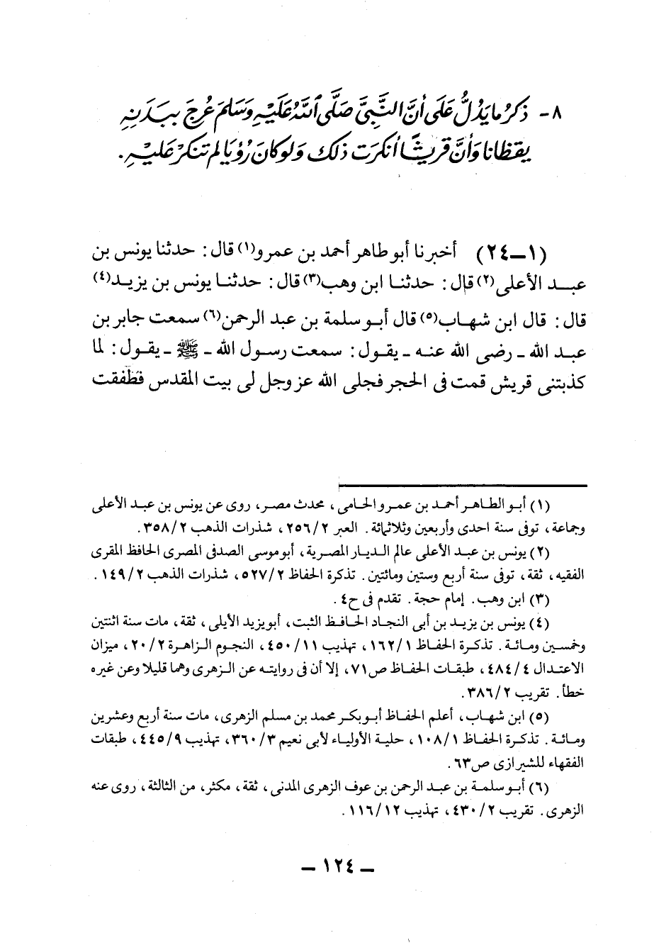 ٢٤ - أَخْبَرَنَا أَبُو طَاهِرٍ أَحمَدُ بْنُ عَمْرٍو، قَالَ: حَدثنا يُونُسُ بْنُ عَبْدِ الأَعْلَى، قَالَ: حَدثنا ابْنُ وَهْبٍ، قَالَ: حَدثنا يُونُسُ بْنُ يَزِيدَ، قَالَ: قَالَ ابْنُ شِهَابٍ: قَالَ أَبُو سَلَمَةَ بْنُ عَبْدِ الرَّحْمَنِ: سَمِعْتُ جَابِرَ بْنَ عَبْدِ الله، رَضِيَ الله عَنْهُ يَقُولُ: سَمِعْتُ رَسُولَ الله صَلى الله عَليه وسَلم يَقُولُ: لمَّا كَذَّبَتْنِي قُرَيْشٌ؛ قُمْتُ فِي الحِجْرِ فَجَلَّى الله، عَزَّ وَجَلَّ، لِيَ بَيْتَ المَقْدِسِ، فَطَفِقْتُ أُخْبِرُهُمْ عَنْ آيَاتِهِ وَأَنَا أَنْظُرُ إِلَيْهِ.