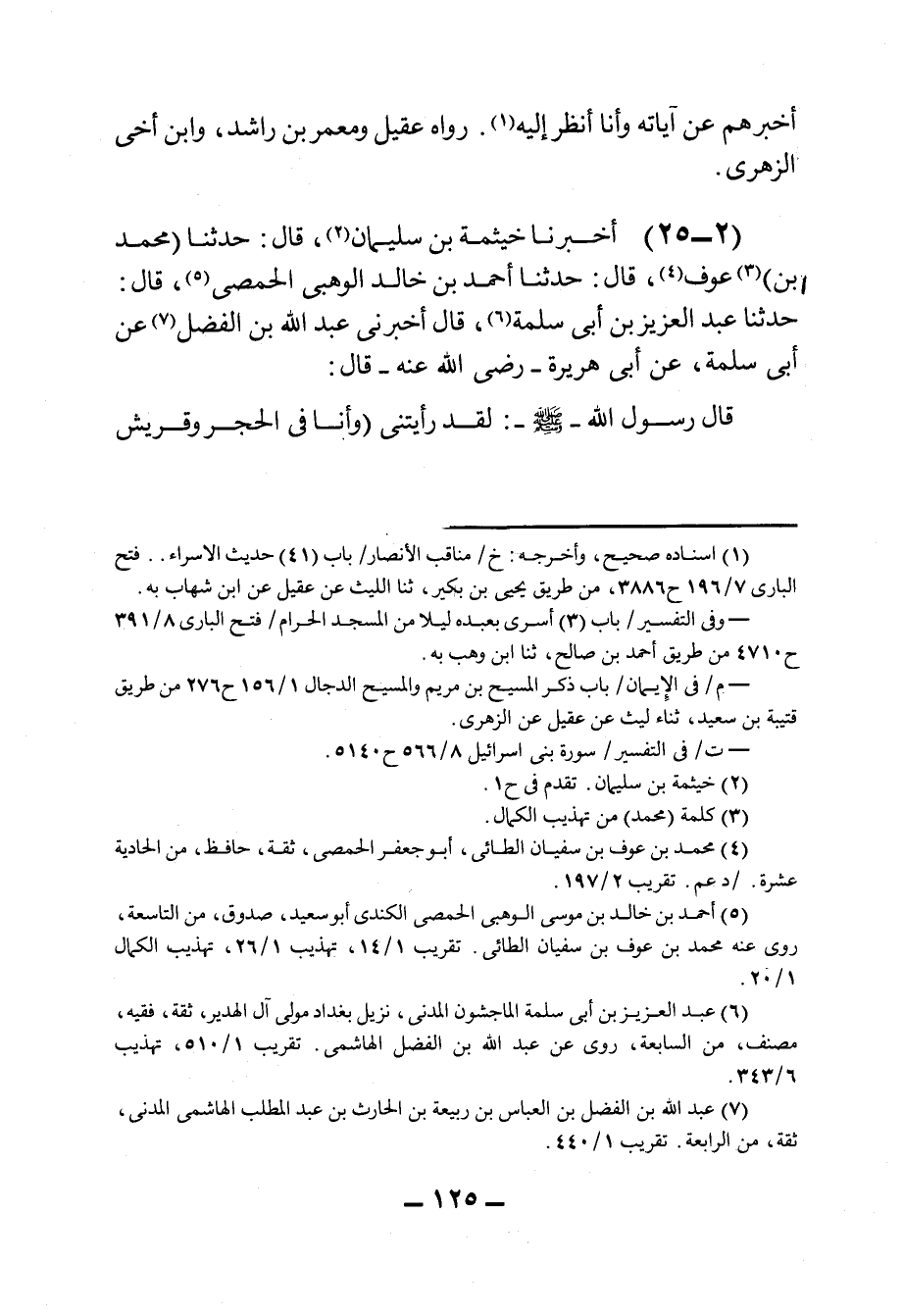٢٥ - أَخْبَرَنَا خَيْثَمَةُ بْنُ سُلَيْمَانَ، قَالَ: حَدثنا مُحَمَّدُ بْنُ عَوْفٍ، قَالَ: حَدثنا أَحمَدُ بْنُ خَالِدٍ الوَهْبِيُّ الحِمْصِيُّ، قَالَ: حَدثنا عَبْدُ العَزِيزِ بْنُ أَبِي سَلَمَةَ، قَالَ: أَخْبَرَنِي عَبْدُ الله بْنُ الفَضْلِ، عَنْ أَبِي سَلَمَةَ، عَنْ أَبِي هُرَيْرَةَ، رَضِيَ الله عَنْهُ، قَالَ: قَالَ رَسُولُ الله صَلى الله عَليه وسَلم: لقَدْ رَأَيْتُنِي وَأَنَا فِي الحِجْرِ وَقُرَيْشٌ تَسْأَلُنِي عَنْ مَسِيرِي، قَالَ: فَسَأَلُونِي عَنْ أَشْيَاءَ، فَلَمْ أُثْبِتْهَا مِنْ بَيْتِ المَقْدِسِ، وَكَرِبْتُ كَرْبًا مَا كَرِبْتُ مِثْلَهُ، فَرَفَعَهُ الله، عَزَّ وَجَلَّ، إِلَيَّ أَنْظُرُ إِلَيْهِ، فَمَا يَسْأَلُونِي عَنْ شَيْءٍ إِلَاّ أَنْبَأْتُهُمْ بِهِ، وَقَدْ رَأَيْتُنِي فِي جَمَاعَةٍ مِنَ الأَنْبِيَاءِ، فَإِذَا مُوسَى، عَلَيْهِ السَّلَامُ قَائِمٌ، وَإِذَا رَجُلٌ ضَرْبٌ جَعْدٌ كَأَنَّهُ مِنْ رِجَالِ شَنُوءَةَ، وَإِذَا عِيسَى بْنُ مَرْيَمَ أَقْرَبُ النَّاسِ بِهِ شَبَهًا عُرْوَةُ بْنُ مَسْعُودٍ الثَّقَفِيُّ، وَإِذَا إِبْرَاهِيمُ، عَلَيْهِ السَّلَامُ قَائِمٌ يُصَلِّي أَشْبَهُ النَّاسِ بِهِ صَاحِبُكُمْ يَعْنِي نَفْسَهُ قَالَ: فَحَانَتِ الصَّلَاةُ فَأَمَمْتُهُمْ.