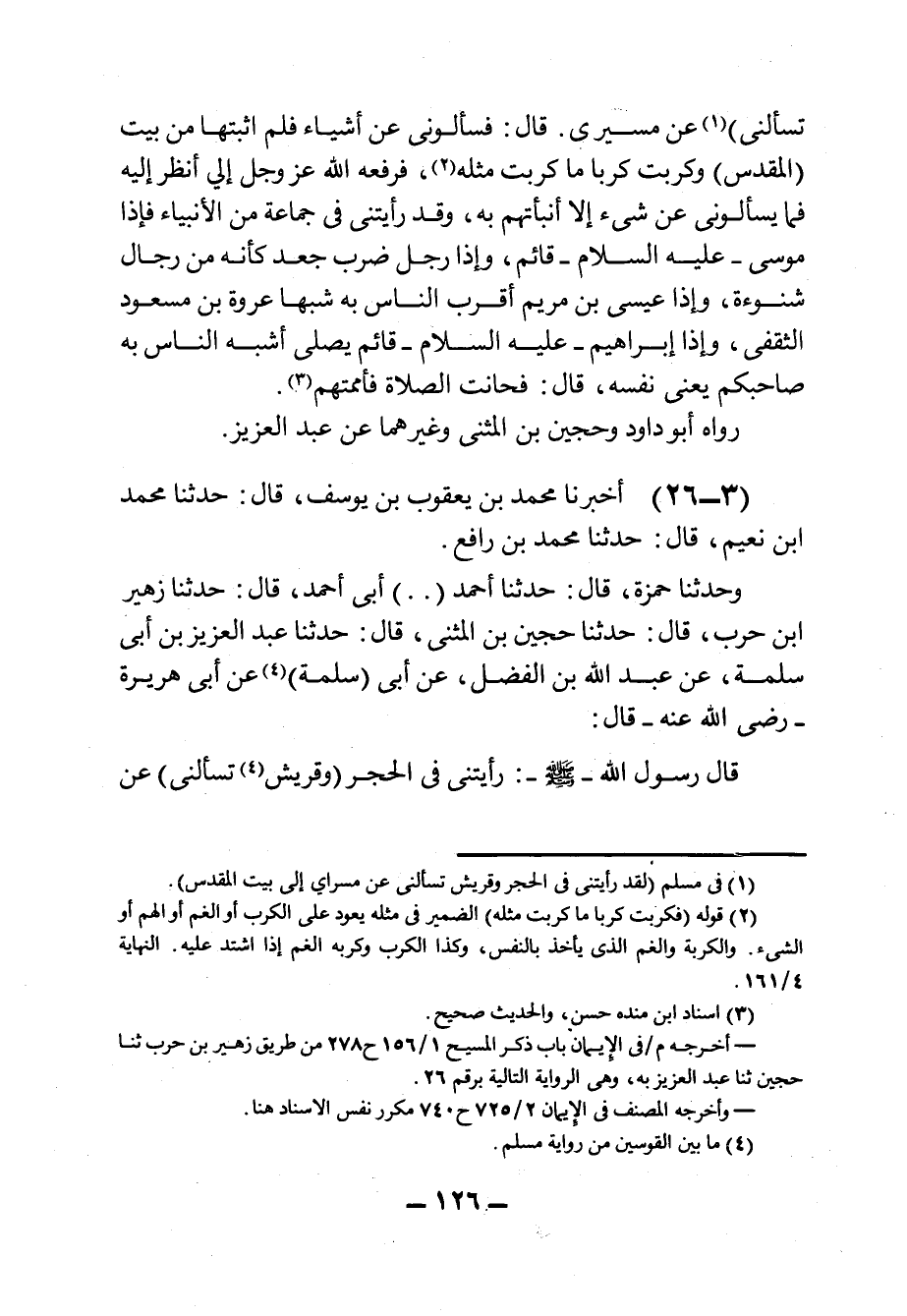٢٦ - أَخْبَرَنَا مُحَمَّدُ بْنُ يَعْقُوبَ بْنُ يُوسُفَ، قَالَ: حَدثنا مُحَمَّدُ بْنُ نُعَيْمٍ، قَالَ: حَدثنا مُحَمَّدُ بْنُ رَافِعٍ، وَحَدثنا حَمْزَةُ، قَالَ: حَدثنا أَحمَدُ أَبِي أَحمَد، قَالَ: حَدثنا زُهَيْرُ بْنُ حَرْبٍ، قَالَ: حَدثنا حُجَيْنُ بْنُ المُثَنَّى، قَالَ: حَدثنا عَبْدُ العَزِيزِ بْنُ أَبِي سَلَمَةَ، عَنْ عَبْدِ الله بْنِ الفَضْلِ، عَنْ أَبِي سَلَمَةَ، عَنْ أَبِي هُرَيْرَةَ، رَضِيَ الله عَنْهُ، قَالَ: قَالَ رَسُولُ الله صَلى الله عَليه وسَلم: رَأَيْتُنِي فِي الحِجْرِ، وَقُرَيْشٌ تَسْأَلُنِي عَنْ مَسْرَايَ، فَسَأَلُونِي عَنْ أَشْيَاءَ مِنْ بَيْتِ المَقْدِسِ لمْ أُثْبِتْهَا فَكَرِبْتُ كَرْبًا مَا كَرِبْتُ مِثْلَهُ قَطُّ، فَرَفَعَهُ الله، عَزَّ وَجَلَّ، لِي أَنْظُرُ إِلَيْهِ، فَمَا يَسْأَلُونِي عَنْ شَيْءٍ إِلَاّ أَنْبَأْتُهُمْ بِهِ، وَقَدْ رَأَيْتُنِي وَجَمَاعَةٌ مِنَ الأَنْبِيَاءِ، فَإِذَا مُوسَى عَلَيْهِ السَّلَامُ قَائِمٌ يُصَلِّي، وَإِذَا رَجُلٌ ضَرْبٌ جَعْدٌ كَأَنَّهُ مِنْ رِجَالِ شَنُوءَةَ، وَإِذَا عِيسَى بْنُ مَرْيَمَ قَائِمٌ يُصَلِّي، أَقْرَبُ النَّاسِ بِهِ شَبَهًا عُرْوَةُ بْنُ مَسْعُودٍ الثَّقَفِي، وَإِذَا إِبْرَاهِيمُ قَائِمٌ يُصَلِّي أَشْبَهُ النَّاسِ بِهِ صَاحِبُكُمْ يَعْنِي نَفْسَهُ، فَحَانَتِ الصَّلَاةُ فَأَمَمْتُهُمْ، فَلَمَّا فَرَغْتُ مِنَ الصَّلَاةِ قَالَ لِي قَائِلٌ: يَا مُحَمَّدُ هَذَا مَالِكٌ صَاحِبُ النَّارِ فَسَلِّمْ عَلَيْهِ، فَالتَفَتُّ فَبَدَأَنِي بِالسَّلَامِ.