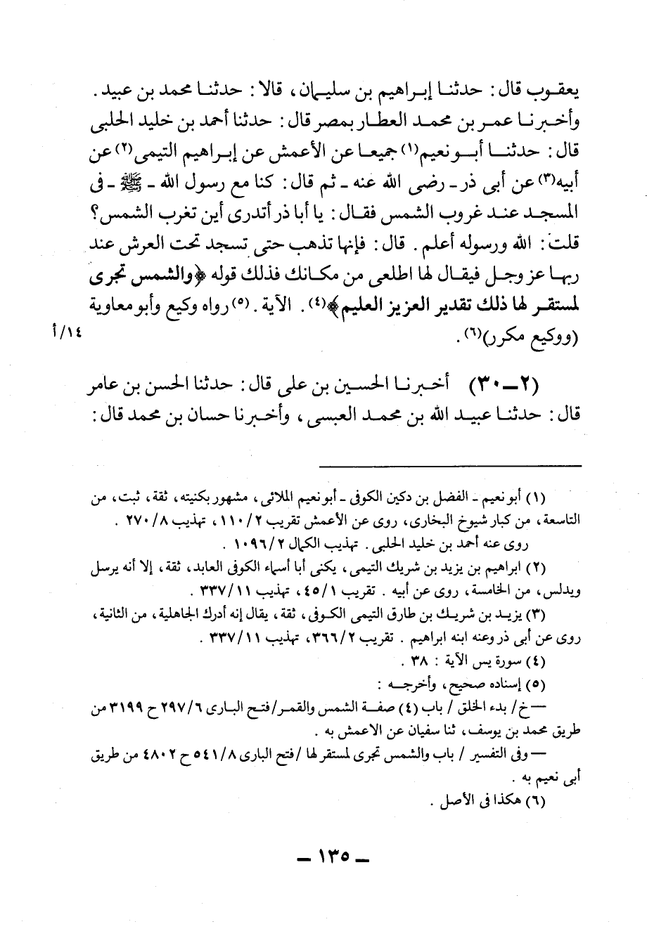٣٠ - أَخْبَرَنَا الحُسَيْنُ بْنُ عَلِيٍّ، قَالَ: حَدثنا الحَسَنُ بْنُ عَامِرٍ، قَالَ: حَدثنا عُبيدُ الله بْنُ مُحَمَّدٍ العَبْسِيُّ، وَأَخْبَرَنَا حَسَّانُ بْنُ مُحَمَّدٍ، قَالَ: حَدثنا إِبْرَاهِيمُ بْنُ أَبِي طَالِبٍ، قَالَ: حَدثنا أَبُو كُرَيْبٍ مُحَمَّدُ بْنُ العَلَاءِ قَالَا: حَدثنا أَبُو مُعَاوِيَةَ، عَنِ الأَعْمَشِ، عَنْ إِبْرَاهِيمَ التَّيْمِيِّ، عَنْ أَبِيهِ، عَنْ أَبِي ذَرٍّ، رَضِيَ الله عَنْهُ قَالَ: دَخَلْتُ المَسْجِدَ وَرَسُولُ الله صَلى الله عَليه وسَلم جَالِسٌ فَلَمَّا غَابَتِ الشَّمْسُ قَالَ: يَا أَبَا ذَرٍّ أَتَدْرِي أَيْنَ تَذْهَبُ هَذِهِ؟ قُلْتُ: الله وَرَسُولُهُ أَعْلَمُ قَالَ: فَإِنَّهَا تَذْهَبُ فَتَسْتَأْذِنُ فِي السُّجُودِ، فَيُؤْذَنُ لهَا، وَكَأَنَّهَا قِيلَ لهَا: ارْجِعِي مِنْ حَيْثُ جِئْتِ قَالَ: فَتَطْلُعُ مِنْ مَغْرِبِهَا قَالَ: ثُمَّ قَرَأَ فِي قِرَاءَةِ عَبْدِ الله، وَذَلِكَ مُسْتَقَرٌّ لهَا.