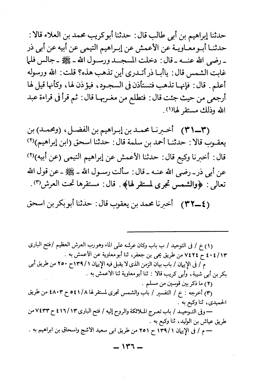 ٣١ - أَخْبَرَنَا مُحَمَّدُ بْنُ إِبْرَاهِيمَ بْنِ الفَضْلِ، وَمُحَمَّدُ بْنُ يَعْقُوبَ قَالَا: حَدثنا أَحمَدُ بْنُ سَلَمَةَ، قَالَ: حَدثنا إِسْحَاقُ بْنُ إِبْرَاهِيمَ، قَالَ: أَخْبَرَنَا وَكِيعٌ، قَالَ: حَدثنا الأَعْمَشُ، عَنْ إِبْرَاهِيمَ التَّيْمِيِّ، عَنْ أَبِيهِ، عَنْ أَبِي ذَرٍّ، رَضِيَ الله عَنْهُ، قَالَ: سَأَلْتُ رَسُولَ الله صَلى الله عَليه وسَلم عَنْ قَوْلِ الله تَعَالَى: {وَالشَّمْسُ تَجْرِي لِمُسْتَقَرٍّ لهَا} قَالَ: مُسْتَقَرُّهَا تَحْتَ العَرْشِ.