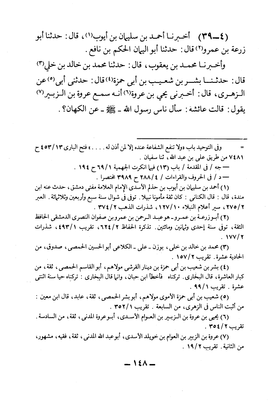 وَأَخْبَرَنَا مُحَمَّدُ بْنُ يَعْقُوبَ، قَالَ: حَدثنا مُحَمَّدُ بْنُ خَالِدِ بْنِ خَلِيٍّ، قَالَ: حَدثنا بِشْرُ بْنُ شُعَيْبِ بْنِ أَبِي حَمْزَةَ، قَالَ: حَدَّثَنِي أَبِي، عَنِ الزُّهْرِيِّ، قَالَ: أَخْبَرَنِي يَحْيَى بْنُ عُرْوَةَ، أَنَّهُ سَمِعَ عُرْوَةَ بْنَ الزُّبَيْرِ، يَقُولُ: قَالَتْ عَائِشَةُ: سَأَلَ نَاسٌ رَسُولَ الله صَلى الله عَليه وسَلم عَنِ الكُهَّانِ؟ فَقَالَ لهُمْ رَسُولُ الله، صَلى الله عَليه وسَلم: ليْسُوا بِشَيْءٍ، قَالُوا: يَا رَسُولَ الله فَإِنَّهُمْ يُحَدِّثُونَ أَحْيَانًا بِالشَّيْءِ يَكُونُ حَقًّا، فَقَالَ رَسُولُ الله، صَلى الله عَليه وسَلم: تِلْكَ الكَلِمَةُ مِنَ الحَقِّ يَخْطَفُهَا الجِنِّيُّ فَيَقُرُّهَا فِي أُذُنِ وَلِيِّهِ قَرَّ الدَّجَاجَةِ فَيَخْلِطُونَ مَعَهَا أَكْثَرَ مِنْ مِئَةِ كِذْبَةٍ.