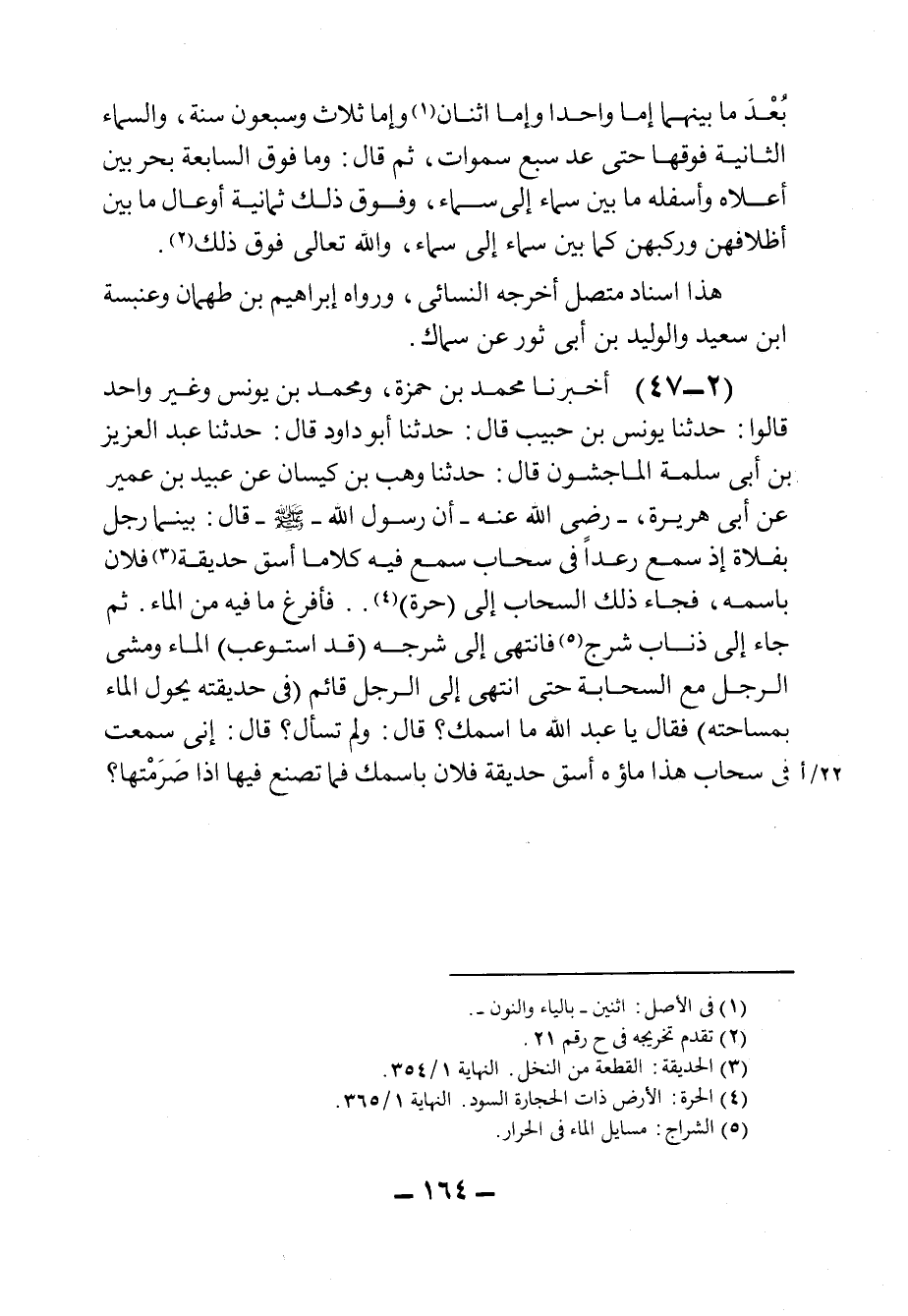 ٤٧ - أَخْبَرَنَا مُحَمَّدُ بْنُ حَمْزَةَ، وَمُحَمَّدُ بْنُ يُونُسَ، وَغَيْرُ وَاحِدٍ، قَالُوا: حَدثنا يُونُسُ بْنُ حَبِيبٍ، قَالَ: حَدثنا أَبُو دَاوُدَ، قَالَ: حَدثنا عَبْدُ العَزِيزِ بْنُ أَبِي سَلَمَةَ المَاجِشُونُ، قَالَ: حَدثنا وَهْبُ بْنُ كَيْسَانَ، عَنْ عُبَيْدِ بْنِ عُمَيْرٍ، عَنْ أَبِي هُرَيْرَةَ، رَضِيَ الله عَنْهُ أَنَّ رَسُولَ الله، صَلى الله عَليه وسَلم قَالَ: بَيْنَمَا رَجُلٌ بِفَلَاةٍ إِذْ سَمِعَ رَعْدًا فِي سَحَابٍ سَمِعَ فِيهِ كَلَامًا: اسْقِ حَدِيقَةَ فُلَانٍ، بِاسْمِهِ، فَجَاءَ ذَلِكَ السَّحَابُ إِلَى حَرَّةٍ فَأَفْرَغَ مَا فِيهِ مِنَ المَاءِ،