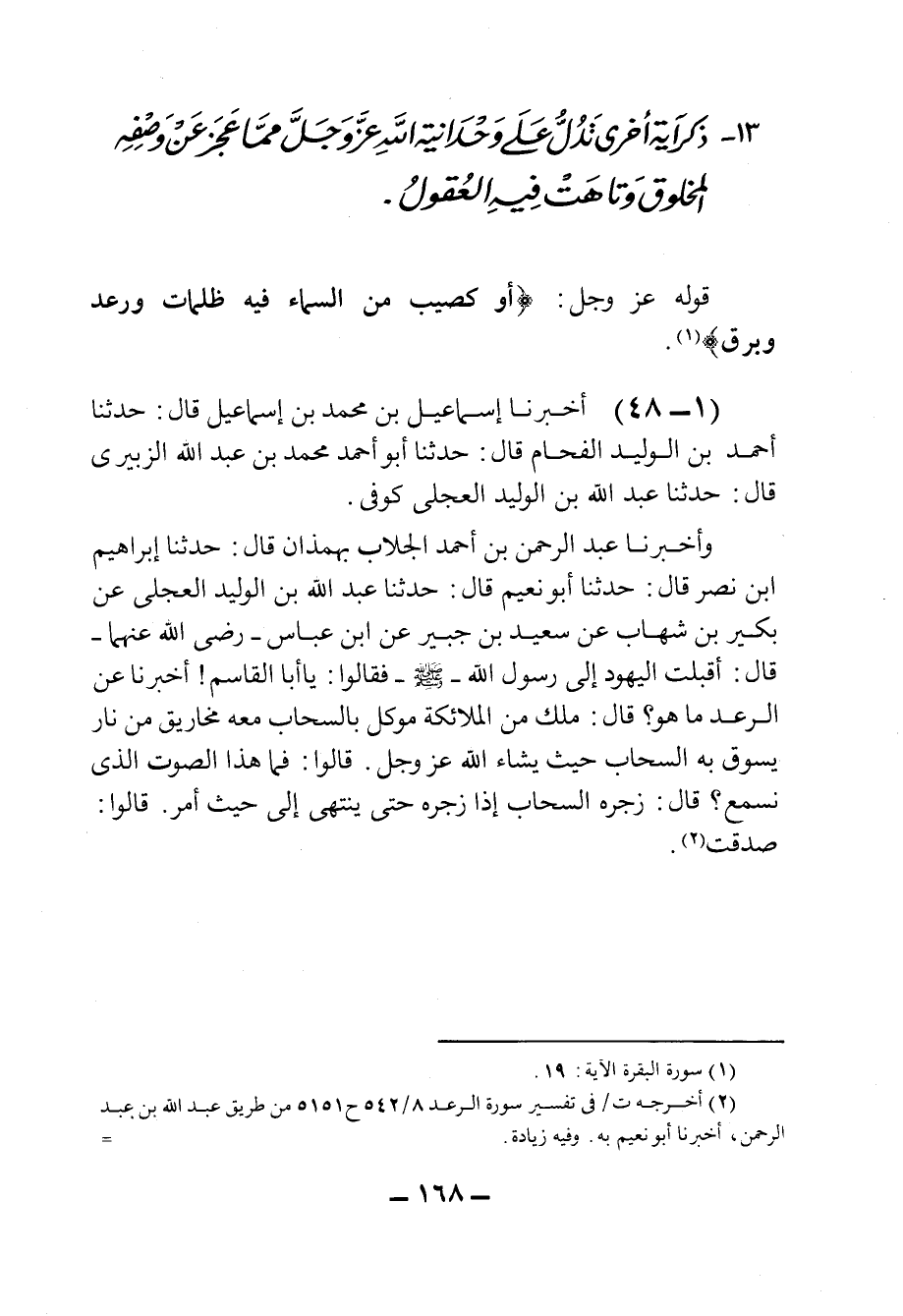 ٤٨ - أَخْبَرَنَا إِسْمَاعِيلُ بْنُ مُحَمَّدِ بْنِ إِسْمَاعِيلَ، قَالَ: حَدثنا أَحمَدُ بْنُ الوَلِيدِ الفَحَّامُ، قَالَ: حَدثنا أَبُو أَحمَد مُحَمَّدُ بْنُ عَبْدِ الله الزُّبَيْرِيُّ، قَالَ: حَدثنا عَبْدُ الله بْنُ الوَلِيدِ العِجْلِيُّ، كُوفِيٌّ. وَأَخْبَرَنَا عَبْدُ الرَّحْمَنِ بْنُ أَحمَد الجَلَاّبُ، بِهَمَذَانَ، قَالَ: حَدثنا إِبْرَاهِيمُ بْنُ نَصْرٍ، قَالَ: حَدثنا أَبُو نُعَيْمٍ، قَالَ: حَدثنا عَبْدُ الله بْنُ الوَلِيدِ العِجْلِيُّ، عَنْ بُكَيْرِ بْنِ شِهَابٍ، عَنْ سَعِيدِ بْنِ جُبَيْرٍ، عَنِ ابْنِ عَبَّاسٍ، رَضِيَ الله عَنْهُمَا قَالَ: أَقْبَلَتِ اليَهُودُ إِلَى رَسُولِ الله صَلى الله عَليه وسَلم فَقَالُوا: يَا أَبَا القَاسِمِ أَخْبِرْنَا عَنِ الرَّعْدِ مَا هُوَ؟ قَالَ: مَلَكٌ مِنَ المَلَائِكَةَ مُوَكَّلٌ بِالسَّحَابِ، مَعَهُ مَخَارِيقُ مِنْ نَارٍ يَسُوقُ بِهِ السَّحَابَ حَيْثُ يَشَاءُ الله، عَزَّ وَجَلَّ، قَالُوا: فَمَا هَذَا الصَّوْتُ الَّذِي نَسْمَعُ؟ قَالَ: زَجْرُهُ السَّحَابَ إِذَا زَجَرَهُ حَتَّى يَنْتَهِيَ إِلَى حَيْثُ أُمِرَ، قَالُوا: صَدَقْتَ.
