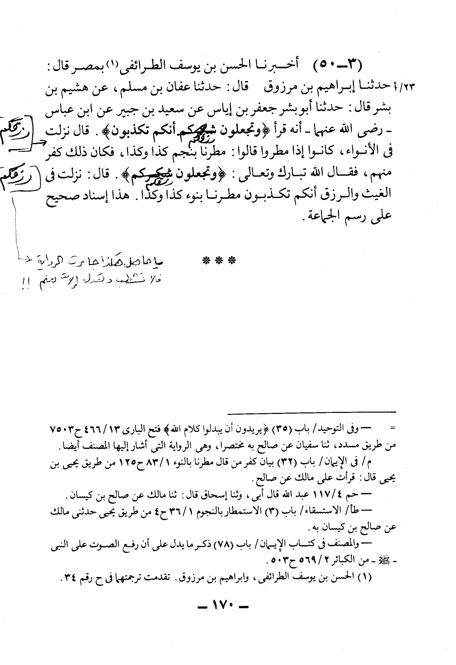 ٥٠ - أَخْبَرَنَا الحَسَنُ بْنُ يُوسُفَ الطَّرَائِفِيُّ، بِمِصْرَ، قَالَ: حَدثنا إِبْرَاهِيمُ بْنُ مَرْزُوقٍ، قَالَ: حَدثنا عَفَّانُ بْنُ مُسْلِمٍ، عَنْ هُشَيْمِ بْنِ بِشْرٍ، قَالَ: حَدثنا أَبُو بِشْرٍ جَعْفَرُ بْنُ إِيَاسٍ، عَنْ سَعِيدِ بْنِ جُبَيْرٍ، عَنِ ابْنِ عَبَّاسٍ، رَضِيَ الله عَنْهُمَا، أَنَّهُ قَرَأَ: (وَتَجْعَلُونَ شُكْرَكُمْ أَنَّكُمْ تُكَذِّبُونَ). قَالَ نَزَلَتْ فِي الأَنْوَاءِ، كَانُوا إِذَا مُطِرُوا قَالُوا: مُطِرْنَا بِنَجْمِ كَذَا وَكَذَا، فَكَانَ ذَلِكَ كُفْرٌ مِنْهُمْ، فَقَالَ الله تَبَارَكَ وَتَعَالَى: (وَتَجْعَلُونَ شُكْرَكُمْ) قَالَ: نَزَلَتْ فِي الغَيْثِ وَالرِّزْقِ أَنَّكُمْ تُكَذِّبُونَ مُطِرْنَا بِنَوْءِ كَذَا وَكَذَا.