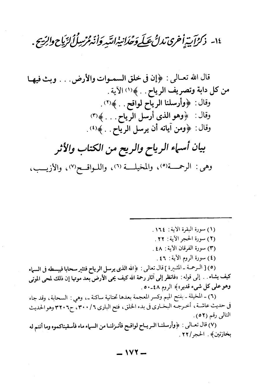 ١٤ - ذِكْرُ آيَةٍ أُخْرَى تَدُلُّ عَلَى وَحْدَانِيَّةِ الله، وَأَنَّهُ مُرْسِلُ الرِّيَاحَ وَالرِّيحَ