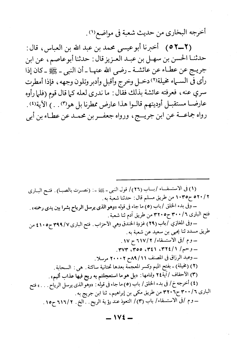 ٥٢ - أَخْبَرَنَا أَبُو عِيسَى مُحَمَّدُ بْنُ عَبْدِ الله بْنِ العَبَّاسِ، قَالَ: حَدثنا الحَسَنُ بْنُ سَهْلِ بْنِ عَبْدِ العَزِيزِ، قَالَ: حَدثنا أَبُو عَاصِمٍ، عَنِ ابْنِ جُرَيْجٍ، عَنْ عَطَاءٍ، عَنْ عَائِشَةَ، رَضِيَ الله عَنْهَا أَنَّ النَّبِيَّ صَلى الله عَليه وسَلم كَانَ إِذَا رَأَى فِي السَّمَاءِ مَخِيلَةً دَخَلَ وَخَرَجَ وَأَقْبَلَ وَأَدْبَرَ وَتَلَوَّنَ وَجْهُهُ، فَإِذَا أَمْطَرَتْ سُرِّيَ عَنْهُ، فَعَرَّفَتْهُ عَائِشَةُ بِذَلِكَ فَقَالَ: مَا نَدْرِي لعَلَّهُ كَمَا قَالَ قَوْمٌ: {فَلَمَّا رَأَوْهُ عَارِضًا مُسْتَقْبِلَ أَوْدِيَتِهِمْ قَالُوا هَذَا عَارِضٌ مُمْطِرُنَا بَلْ هُوَ ... } الآيَةَ.