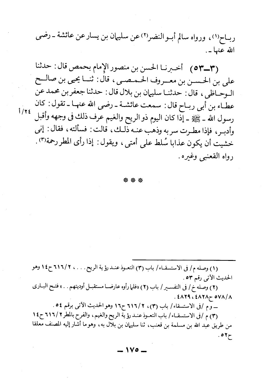 ٥٣ - أَخْبَرَنَا الحَسَنُ بْنُ مَنْصُورٍ الإِمَامُ، بِحِمْصَ، قَالَ: حَدثنا عَلِيُّ بْنُ الحَسَنِ بْنِ مَعْرُوفٍ الحِمْصِيُّ، قَالَ: حَدثنا يَحْيَى بْنُ صَالِحٍ الوُحَاظِيُّ، قَالَ: حَدثنا سُلَيْمَانُ بْنُ بِلَالٍ، قَالَ: حَدثنا جَعْفَرُ بْنُ مُحَمَّدٍ، عَنْ عَطَاءِ بْنِ أَبِي رَبَاحٍ، قَالَ: سَمِعْتُ عَائِشَةَ، رَضِيَ الله عَنْهَا تَقُولُ: كَانَ رَسُولُ الله صَلى الله عَليه وسَلم، إِذَا كَانَ اليَوْمُ ذُو الرِّيحِ وَالغَيْمِ عُرِفَ ذَلِكَ فِي وَجْهِهِ وَأَقْبَلَ وَأَدْبَرَ، فَإِذَا مَطَرَتْ سُرَّ بِهِ وَذَهَبَ عَنْهُ ذَلِكَ قَالَتْ: فَسَأَلْتُهُ، فَقَالَ: إِنِّي خَشِيتُ أَنْ يَكُونَ عَذَابًا سُلِّطَ عَلَى أُمَّتِي، وَيَقُولُ إِذَا رَأَى المَطَرَ: رَحْمَةً.