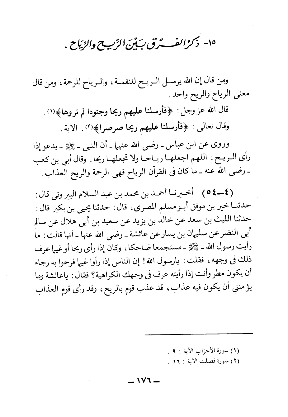 وَمَنْ قَالَ: إِنَّ الله يُرْسِلُ الرِّيحَ لِلنِّقْمَةِ، وَالرِّيَاحَ لِلرَّحْمَةِ، وَمَنْ قَالَ: مَعْنَى الرِّيَاحِ وَالرِّيحِ وَاحِدٌ. قَالَ الله عَزَّ وَجَلَّ: {فَأَرْسَلْنَا عَلَيْهِمْ رِيحًا وَجُنُودًا لمْ تَرَوْهَا}.