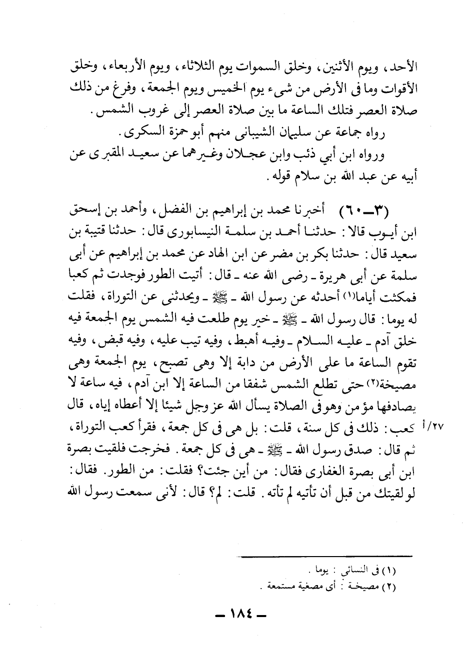 ٦٠ - أَخْبَرَنَا مُحَمَّدُ بْنُ إِبْرَاهِيمَ بْنِ الفَضْلِ، وَأَحمَدُ بْنُ إِسْحَاقَ بْنِ أَيُّوبَ قَالَا: حَدثنا أَحمَدُ بْنُ سَلَمَةَ النَّيْسَابُورِيُّ، قَالَ: حَدثنا قُتَيْبَةُ بْنُ سَعِيدٍ، قَالَ: حَدثنا بَكْرُ بْنُ مُضَرٍ، عَنِ ابْنِ الهَادِ، عَنْ مُحَمَّدِ بْنِ إِبْرَاهِيمَ، عَنْ أَبِي سَلَمَةَ، عَنْ أَبِي هُرَيْرَةَ، رَضِيَ الله عَنْهُ قَالَ: أَتَيْتُ الطُّورَ فَوَجَدْتُ ثَمَّ كَعْبًا فَمَكَثْتُ أَيَّامًا أُحَدِّثُهُ عَنْ رَسُولِ الله صَلى الله عَليه وسَلم وَيُحَدِّثُنِي عَنِ التَّوْرَاةِ، فَقُلْتُ لهُ يَوْمًا: قَالَ رَسُولُ الله صَلى الله عَليه وسَلم: خَيْرُ يَوْمٍ طَلَعَتْ فِيهِ الشَّمْسُ يَوْمَ الجُمُعَةِ فِيهِ خُلِقَ آدَمَ، عَلَيْهِ السَّلَامُ، وَفِيهِ أُهْبِطَ، وَفِيهِ تِيبَ عَلَيْهِ، وَفِيهِ قُبِضَ، وَفِيهِ تَقُومُ السَّاعَةُ مَا عَلَى الأَرْضِ مِنْ دَابَّةٍ إِلَاّ وَهِيَ تُصْبِحُ يَوْمَ الجُمُعَةِ وَهِيَ مُصِيخَةٌ، حَتَّى تَطْلُعَ الشَّمْسُ شَفَقًا مِنَ السَّاعَةِ إِلَاّ ابْنُ آدَمَ، فِيهِ سَاعَةٌ لَا يُصَادِفُهَا مُؤْمِنٌ وَهُوَ فِي الصَّلَاةِ يَسْأَلُ الله عَزَّ وَجَلَّ، شَيْئًا إِلَاّ أَعْطَاهُ إِيَّاهُ،