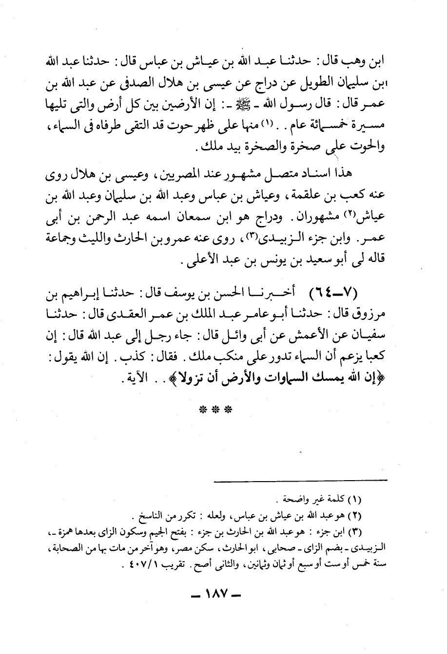 ٦٤ - أَخْبَرَنَا الحَسَنُ بْنُ يُوسُفَ، قَالَ: حَدثنا إِبْرَاهِيمُ بْنُ مَرْزُوقٍ، قَالَ: حَدثنا أَبُو عَامِرٍ عَبْدُ المَلِكِ بْنُ عُمَرَ العَقَدِيُّ، قَالَ: حَدثنا سُفْيَانُ، عَنِ الأَعْمَشِ، عَنْ أَبِي وَائِلٍ قَالَ: جَاءَ رَجُلٌ إِلَى عَبْدِ الله قَالَ: إِنَّ كَعْبًا يَزْعُمُ أَنَّ السَّمَاءَ تَدُورُ عَلَى مَنْكِبِ مَلَكٍ، فَقَالَ: كَذَبَ، إِنَّ الله يَقُولُ: {إِنَّ الله يُمْسِكُ السَّمَاوَاتِ وَالأَرْضَ أَنْ تَزُولَا}. الآيَةُ