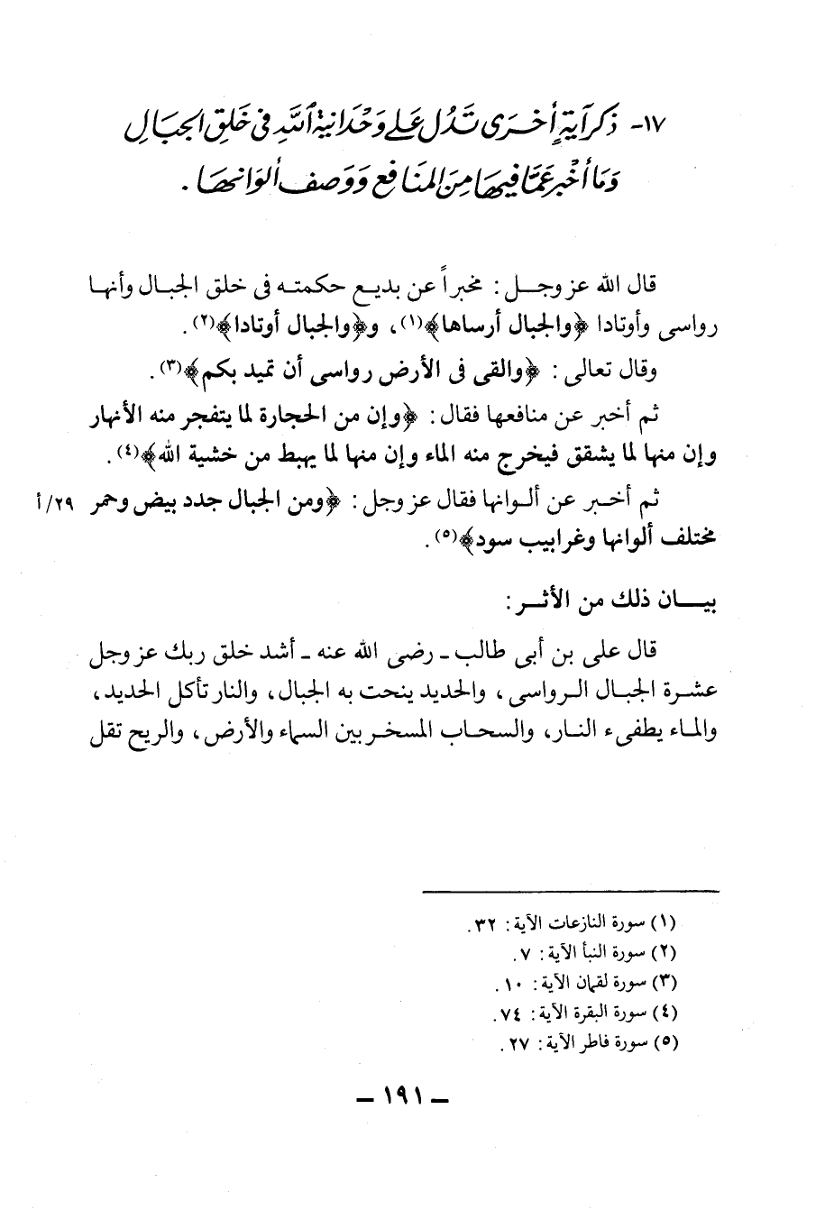 وَقَالَ تَعَالَى: {وَأَلْقَى فِي الأَرْضِ رَوَاسِيَ أَنْ تَمِيدَ بِكُمْ} ثُمَّ أَخْبَرَ عَنْ مَنَافِعِهَا فَقَالَ: {وَإِنَّ مِنَ الحِجَارَةِ لمَا يَتَفَجَّرُ مِنْهُ الأَنْهَارُ وَإِنَّ مِنْهَا لمَا يَشَّقَقُ فِيخْرُجُ مِنْهُ المَاءُ وَإِنَّ مِنْهَا لمَا يَهْبِطُ مِنْ خَشْيَةِ الله}.