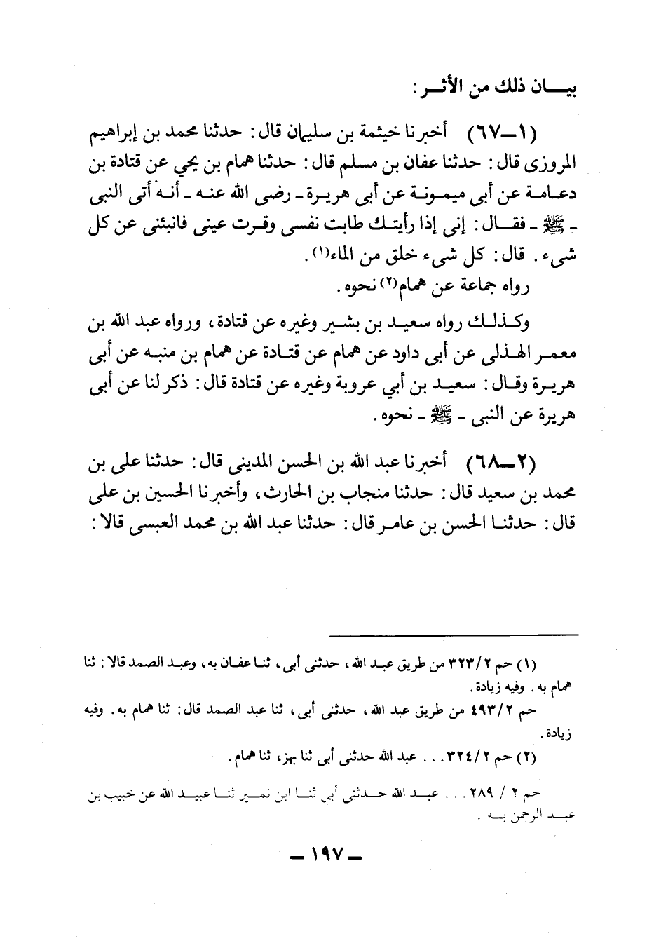 ٦٧ - أَخْبَرَنَا خَيْثَمَةُ بْنُ سُلَيْمَانَ، قَالَ: حَدثنا مُحَمَّدُ بْنُ إِبْرَاهِيمَ المَرْوَزِيُّ، قَالَ: حَدثنا عَفَّانُ بْنُ مُسْلِمٍ، قَالَ: حَدثنا هَمَّامُ بْنُ يَحْيَى، عَنْ قَتَادَةَ بْنِ دِعَامَةَ، عَنْ أَبِي مَيْمُونَةَ، عَنْ أَبِي هُرَيْرَةَ، رَضِيَ الله عَنْهُ أَنَّهُ أَتَى النَّبِيَّ صَلى الله عَليه وسَلم فَقَالَ: إِنِّي إِذَا رَأَيْتُكَ طَابَتْ نَفْسِي وَقَرَّتْ عَيْنِي فَأَنْبِئْنِي عَنْ كُلِّ شَيْءٍ. قَالَ: كُلُّ شَيْءٍ خُلِقَ مِنَ المَاءِ.