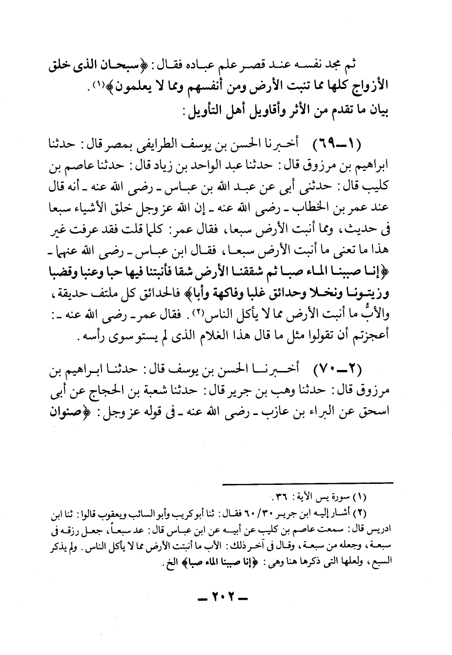 ٦٩ - أَخْبَرَنَا الحَسَنُ بْنُ يُوسُفَ الطَّرَائِفِيُّ، بِمِصْرَ، قَالَ: حَدثنا إِبْرَاهِيمُ بْنُ مَرْزُوقٍ، قَالَ: حَدثنا عَبْدُ الوَاحِدِ بْنُ زِيَادٍ، قَالَ: حَدثنا عَاصِمُ بْنُ كُلَيْبٍ، قَالَ: حَدَّثَنِي أَبِي، عَنْ عَبْدِ الله بْنِ عَبَّاسٍ، رَضِيَ الله عَنْهُ أَنَّهُ قَالَ: عِنْدَ عُمَرَ بْنِ الخَطَّابِ، رَضِيَ الله عَنْهُ، إِنَّ الله، عَزَّ وَجَلَّ، خَلَقَ الأَشْيَاءَ سَبْعًا فِي حَدِيثٍ، وَمِمَّا أَنَبْتَ الأَرْضَ سَبْعًا، فَقَالَ عُمَرُ: كُلَّمَا قُلْتُ فَقَدْ عَرَفْتُ غَيْرَ هَذَا، مَا تَعْنِي مَا أَنْبَتَ الأَرْضَ سَبْعًا، فَقَالَ ابْنُ عَبَّاسٍ، رَضِيَ الله عَنْهُمَا: {أَنَّا صَبَبْنَا المَاءَ صَبًّا ثُمَّ شَقَقْنَا الأَرْضَ شَقًّا فَأَنْبَتْنَا فِيهَا حَبًّا وَعِنَبًا وَقَضْبًا وَزَيْتُونًا وَنَخْلا وَحَدَائِقَ غُلْبًا وَفَاكِهَةً وَأَبًّا} فَالحَدَائِقُ كُلُّ مُلْتَفٍ حَدِيقَةٌ، وَالأَبُّ مَا أَنَبْتَتِ الأَرْضُ مِمَّا لَا يَأْكُلُ النَّاسُ، فَقَالَ عُمَرُ رَضِيَ الله عَنْهُ: أَعَجَزْتُمْ أَنْ تَقُولُوا مِثْلَ مَا قَالَ هَذَا الغُلَامُ الَّذِي لمْ يَسْتَوِ سِوَى رَأْسُهُ.