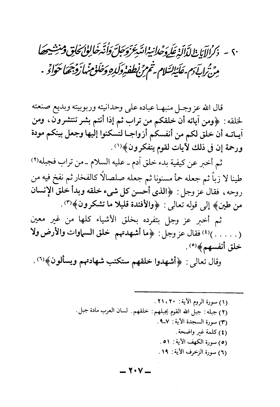 ثُمَّ أَخْبَرَ عَنْ كَيْفِيَّةِ بَدْءِ خَلْقِ آدَمَ عَلَيْهِ السَّلَامُ، مِنْ تُرَابٍ، فَجَبَلَهُ طِينًا لَازِبًا، ثُمَّ جَعَلَهُ حَمَأً مَسْنُونًا، ثُمَّ جَعَلَهُ صَلْصَالاً كَالفَخَّارِ، ثُمَّ نَفَخَ فِيهِ مِنْ رُوحِهِ، فَقَالَ عَزَّ وَجَلَّ: {الَّذِي أَحْسَنَ كُلَّ شَيْءٍ خَلَقَهُ وَبَدَأَ خَلْقَ الإِنْسَانِ مِنْ طِينٍ}، إِلَى قَوْلِهِ تَعَالَى: {وَالأَفْئِدَةَ قَلِيلاً مَا تَشْكُرُونَ} ثُمَّ أَخْبَرَ عَزَّ وَجَلَّ بِتَفَرُّدِهِ بِخَلْقِ الأَشْيَاءِ كُلِّهَا مِنْ غَيْرِ مُعِينٍ، .... فَقَالَ، عَزَّ وَجَلَّ: {مَا أَشْهَدْتُهُمْ خَلْقَ السَّمَاوَاتِ وَالأَرْضِ وَلَا خَلْقَ أَنْفُسِهِمْ}.