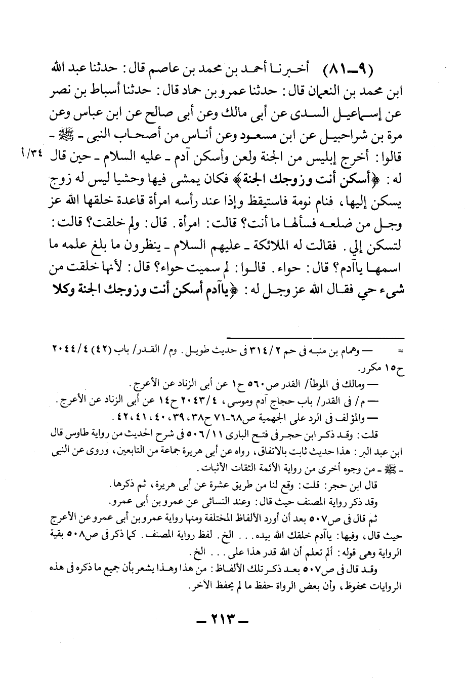 ٨١ - أَخْبَرَنَا أَحمَدُ بْنُ مُحَمَّدِ بْنِ عَاصِمٍ، قَالَ: حَدثنا عَبْدُ الله بْنُ مُحَمَّدِ بْنِ النُّعْمَانِ، قَالَ: حَدثنا عَمْرُو بْنُ حَمَّادٍ، قَالَ: حَدثنا أَسْبَاطُ بْنُ نَصْرٍ، عَنْ إِسْمَاعِيلَ السُّدِّيِّ، عَنْ أَبِي مَالِكٍ، وَعَنْ أَبِي صَالِحٍ، عَنِ ابْنِ عَبَّاسٍ، وَعَنْ مُرَّةَ بْنِ شُرَاحَبِيلَ، عَنِ ابْنِ مَسْعُودٍ، وَعَنْ أُنَاسٍ مِنْ أَصْحَابِ النَّبِيِّ صَلى الله عَليه وسَلم قَالُوا: أُخْرِجَ إِبْلِيسُ مِنَ الجَنَّةِ وَلُعِنَ، وَأُسْكِنَ آدَمُ عَلَيْهِ السَّلَامُ، حِينَ قَالَ لهُ: {اسْكُنْ أَنْتَ وَزَوْجُكَ الجَنَّةَ} فَكَانَ يَمْشِي فِيهَا وَحْشِيًّا ليْسَ لهُ زَوْجٌ يَسْكُنُ إِلَيْهَا، فَنَامَ نَوْمَةً فَاسْتَيْقَظَ وَإِذَا عِنْدَ رَأْسِهِ امْرَأَةٌ قَاعِدَةٌ خَلَقَهَا الله، عَزَّ وَجَلَّ، مِنْ ضِلْعِهِ، فَسَأَلَهَا مَا أَنْتِ؟ قَالَتِ: امْرَأَةٌ،