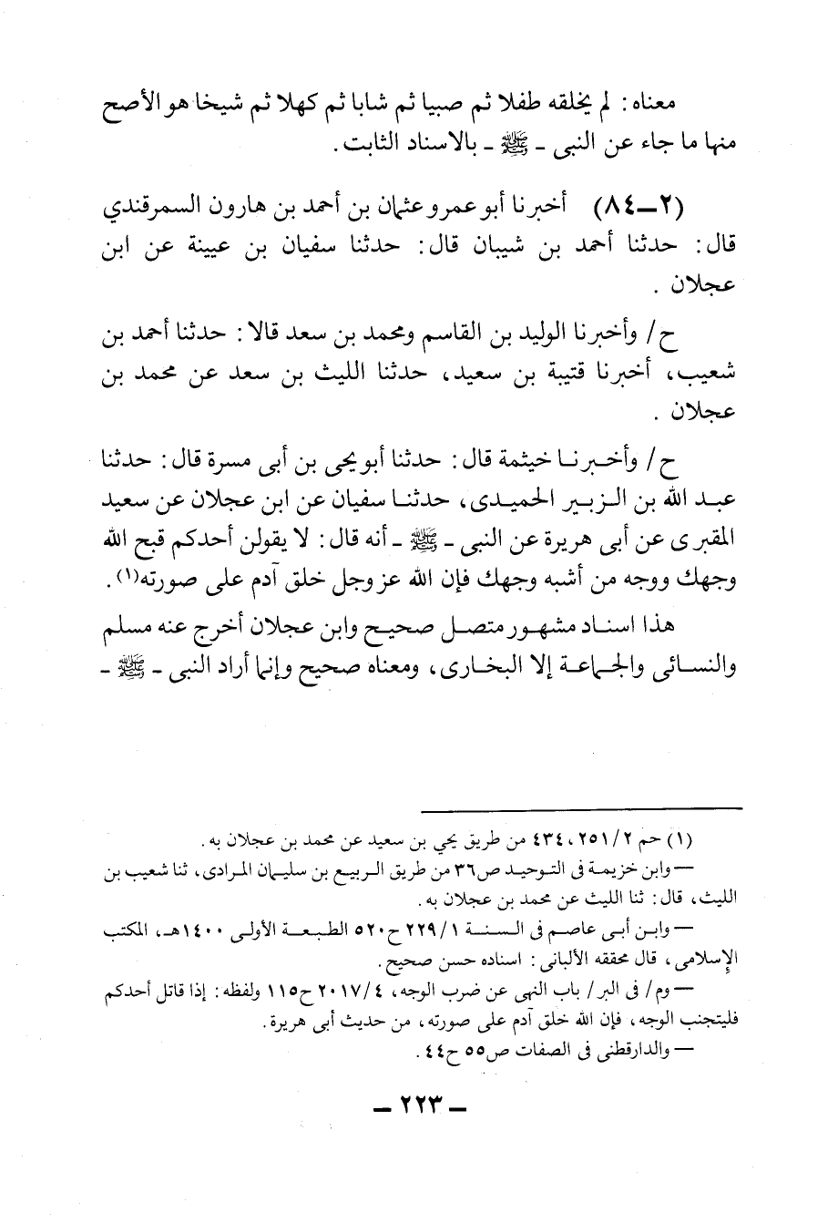 ٨٤ - أَخْبَرَنَا أَبُو عَمْرٍو عُثْمَانُ بْنُ أَحمَد بْنِ هَارُونَ السَّمَرْقَنْدِيُّ، قَالَ: حَدثنا أَحمَدُ بْنُ شَيْبَانَ، قَالَ: حَدثنا سُفْيَانُ بْنُ عُيَيْنَةَ، عَنِ ابْنِ عَجْلَانَ (ح) وَأَخْبَرَنَا الوَلِيدُ بْنُ القَاسِمِ، وَمُحَمَّدُ بْنُ سَعْدٍ قَالَا: حَدثنا أَحمَدُ بْنُ شُعَيْبٍ، أَخْبَرَنَا قُتَيْبَةُ بْنُ سَعِيدٍ، حَدثنا اللَّيْثُ بْنُ سَعْدٍ، عَنْ مُحَمَّدِ بْنِ عَجْلَانَ ح وَأَخْبَرَنَا خَيْثَمَةُ، قَالَ: حَدثنا أَبُو يَحْيَى بْنُ أَبِي مَسَرَّةَ، قَالَ: حَدثنا عَبْدُ الله بْنُ الزُّبَيْرِ الحُمَيْدِيُّ، حَدثنا سُفْيَانُ، عَنِ ابْنِ عَجْلَانَ، عَنْ سَعِيدٍ المَقْبُرِيِّ، عَنْ أَبِي هُرَيْرَةَ، عَنِ النَّبِيِّ صَلى الله عَليه وسَلم أَنَّهُ قَالَ: لَا يَقُولَنَّ أَحَدُكُمْ قَبَّحَ الله وَجْهَكَ، وَوَجْهَ مَنْ أَشْبَهَ وَجْهَكَ، فَإِنَّ الله عَزَّ وَجَلَّ، خَلَقَ آدَمَ عَلَى صُورَتِهِ.