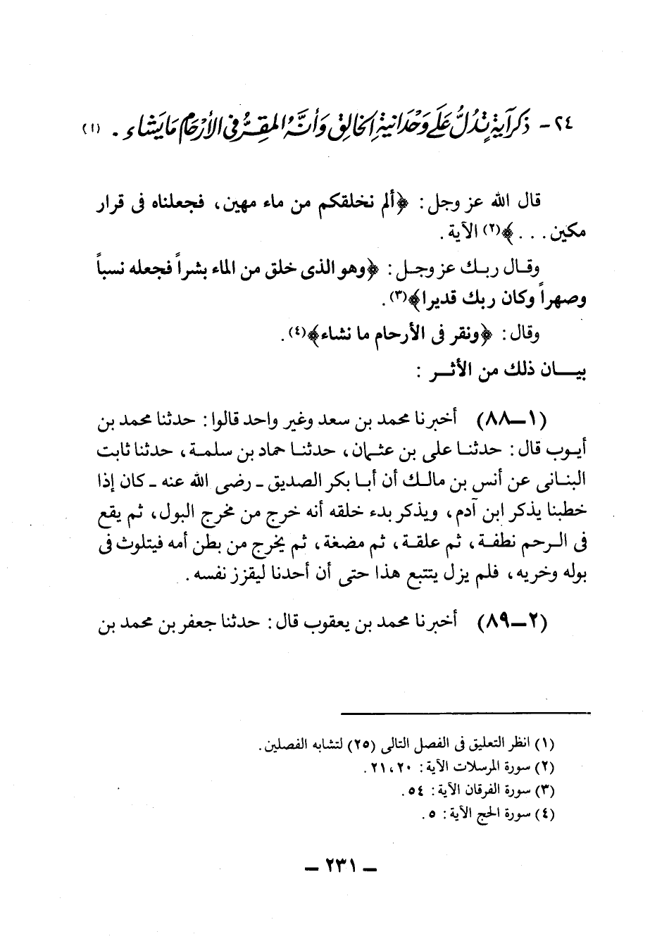٢٤ - ذِكْرُ آيَةٍ تَدُلُّ عَلَى وَحْدَانِيَّةِ الخَالِقِ وَأَنَّهُ المُقِرُّ فِي الأَرْحَامِ مَا يَشَاءُ،