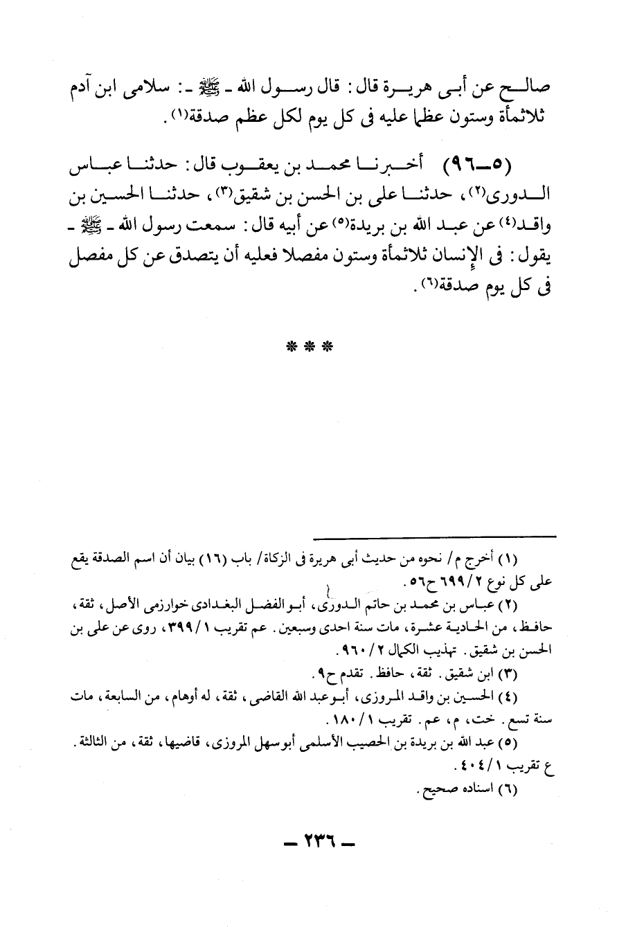٩٦ - أَخْبَرَنَا مُحَمَّدُ بْنُ يَعْقُوبَ، قَالَ: حَدثنا عَبَّاسُ الدُّورِيُّ، حَدثنا عَلِيُّ بْنُ الحَسَنِ بْنِ شَقِيقٍ، حَدثنا الحُسَيْنُ بْنُ وَاقِدٍ، عَنْ عَبْدِ الله بْنِ بُرَيْدَةَ، عَنْ أَبِيهِ قَالَ: سَمِعْتُ رَسُولَ الله صَلى الله عَليه وسَلم يَقُولُ: فِي الإِنْسَانِ ثَلَاثُمِئَةٍ وَسِتُّونَ مَفْصِلاً، فَعَلَيْهِ أَنْ يَتَصَدَّقَ عَنْ كُلِّ مَفْصِلٍ فِي كُلِّ يَوْمٍ صَدَقَةً.
