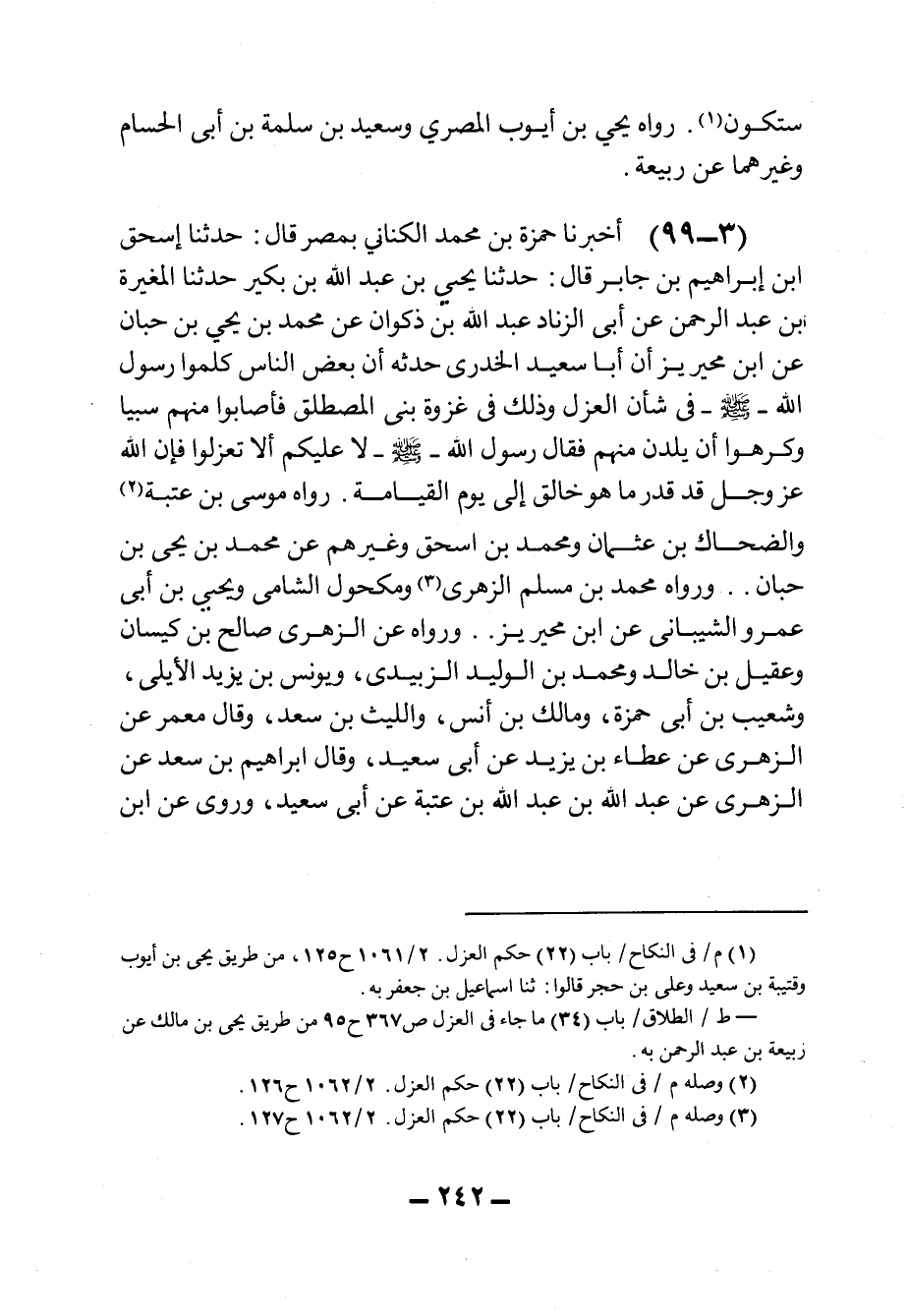 ٩٩ - أَخْبَرَنَا حَمْزَةُ بْنُ مُحَمَّدٍ الكِنَانِيُّ، بِمِصْرَ، قَالَ: حَدثنا إِسْحَاقُ بْنُ إِبْرَاهِيمَ بْنِ جَابِرٍ، قَالَ: حَدثنا يَحْيَى بْنُ عَبْدِ الله بْنِ بُكَيْرٍ، حَدثنا المُغِيرَةُ بْنُ عَبْدِ الرَّحْمَنِ، عَنْ أَبِي الزِّنَادِ عَبْدِ الله بْنِ ذَكْوَانَ، عَنْ مُحَمَّدِ بْنِ يَحْيَى بْنِ حَبَّانٍ، عَنِ ابْنِ مُحَيْرِيزٍ، أَنَّ أَبَا سَعِيدٍ الخُدْرِيَّ حَدَّثَهُ أَنَّ بَعْضَ النَّاسِ كَلَّمُوا رَسُولَ الله صَلى الله عَليه وسَلم فِي شَأْنِ العَزْلِ، وَذَلِكَ فِي غَزْوَةِ بَنِي المُصْطَلِقِ فَأَصَابُوا مِنْهُمْ سَبْيًا وَكَرِهُوا أَنْ يَلِدْنَ مِنْهُمْ فَقَالَ رَسُولُ الله صَلى الله عَليه وسَلم: لَا عَلَيْكُمْ أَلَاّ تَعْزِلُوا فَإِنَّ الله عَزَّ وَجَلَّ، قَدْ قَدَّرَ مَا هُوَ خَالِقٌ إِلَى يَوْمِ القِيَامَةِ.