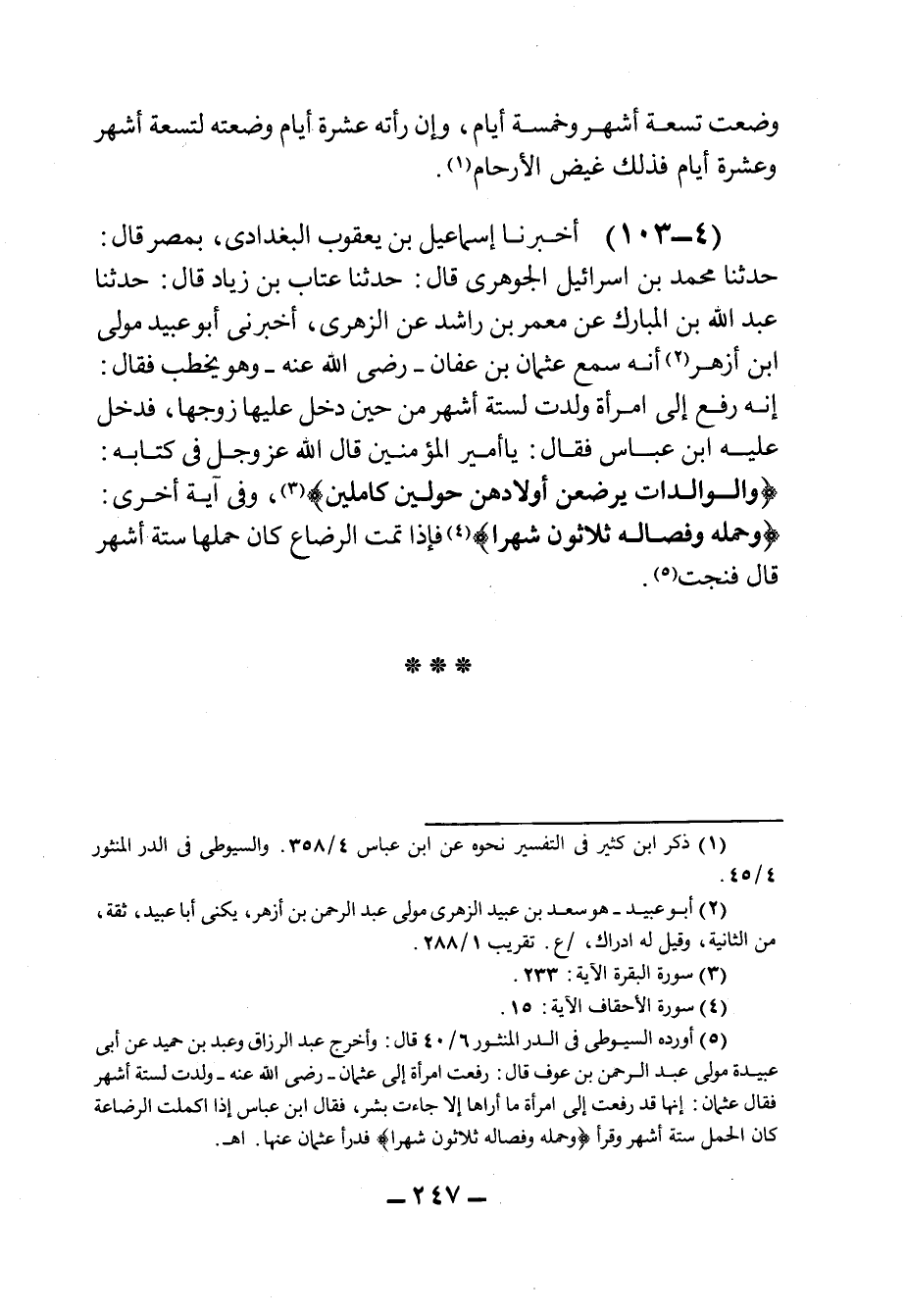 ١٠٣ - أَخْبَرَنَا إِسْمَاعِيلُ بْنُ يَعْقُوبَ البَغْدَادِيُّ، بِمِصْرَ، قَالَ: حَدثنا مُحَمَّدُ بْنُ إِسْرَائِيلَ الجَوْهَرِيُّ، قَالَ: حَدثنا عَتَّابُ بْنُ زِيَادٍ، قَالَ: حَدثنا عَبْدُ الله بْنُ المُبَارَكِ، عَنْ مَعْمَرِ بْنِ رَاشِدٍ، عَنِ الزُّهْرِيِّ، أَخْبَرَنِي أَبُو عُبَيْدٍ، مَوْلَى ابْنِ أَزْهَرَ أَنَّهُ سَمِعَ عُثْمَانَ بْنَ عَفَّانَ، رَضِيَ الله عَنْهُ وَهُوَ يَخْطُبُ فَقَالَ: إِنَّهُ رُفِعَ إِلَيَّ امْرَأَةٌ وَلَدَتْ لِسِتَّةِ أَشْهُرٍ مِنْ حِينِ دَخَلَ عَلَيْهَا زَوْجُهَا، فَدَخَلَ عَلَيْهِ ابْنُ عَبَّاسٍ فَقَالَ: يَا أَمِيرَ المُؤْمِنِينَ، قَالَ الله عَزَّ وَجَلَّ، فِي كِتَابِهِ: {وَالوَالِدَاتُ يُرْضِعْنَ أَوْلَادَهُنَّ حَوْلَيْنِ كَامِلَيْنِ} وَفِي آيَةٍ أُخْرَى: {وَحَمْلُهُ وَفِصَالُهُ ثَلَاثُونَ شَهْرًا} فَإِذَا تَمَّتِ الرَّضَاعَ كَانَ حَمْلُهَا سِتَّةَ أَشْهُرٍ، قَالَ: فَنَجَتْ.
