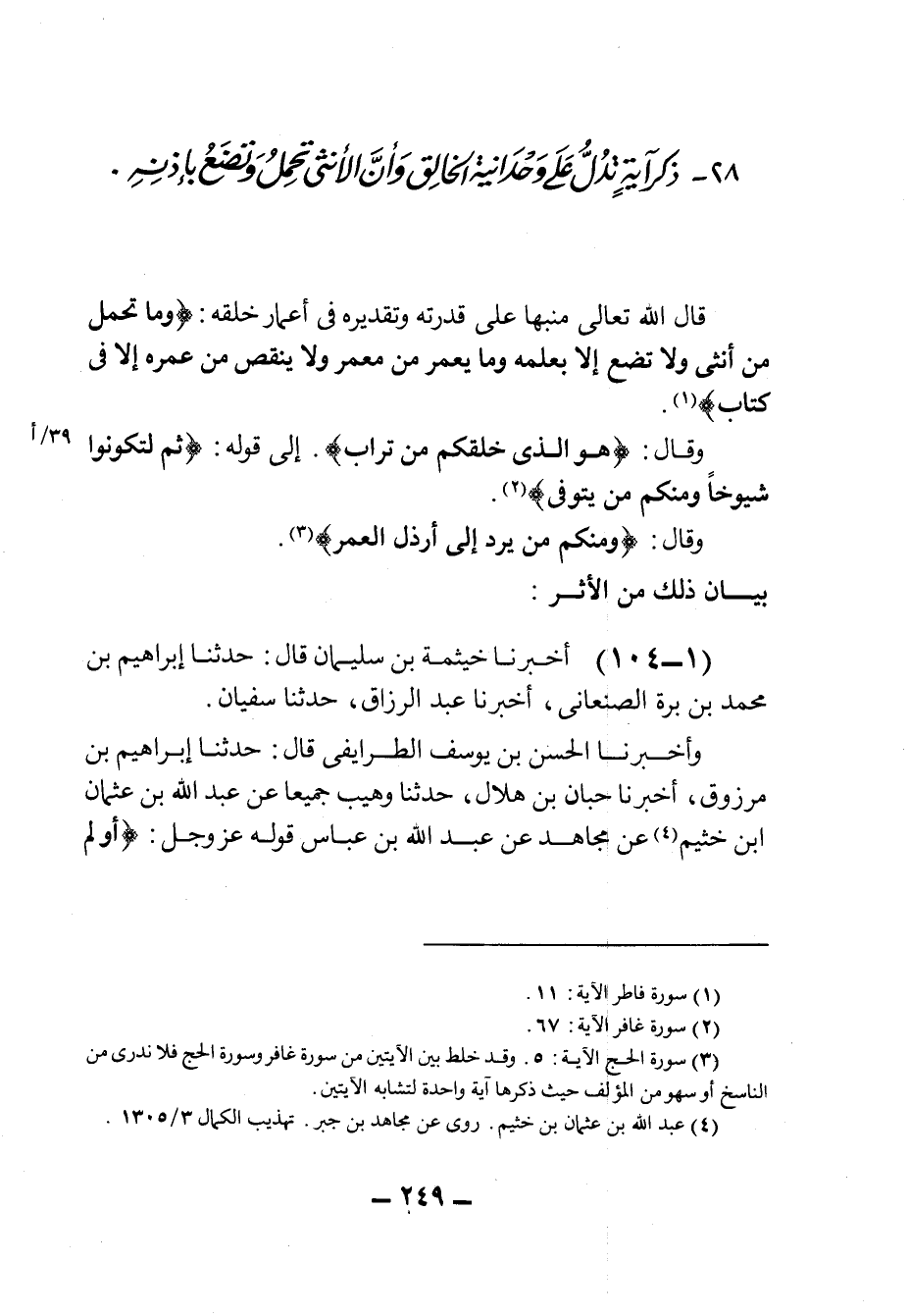 ٢٨ - ذِكْرُ آيَةٍ تَدُلُّ عَلَى وَحْدَانِيَّةِ الخَالِقِ، وَأَنَّ الأُنْثَى تَحْمِلُ وَتَضَعُ بِإِذْنِهِ قَالَ الله تَعَالَى مُنَبِّهًا عَلَى قُدْرَتِهِ وَتَقْدِيرِهِ فِي أَعْمَارِ خَلْقِهِ: