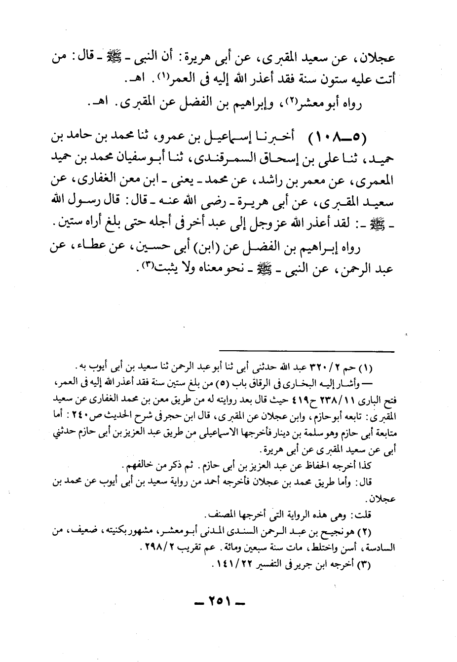 ١٠٨ - أَخْبَرَنَا إِسْمَاعِيلُ بْنُ عمرو، حَدثنا مُحَمَّدُ بْنُ حَامِدِ بْنِ حُمَيْدٍ، حَدثنا عَلِيُّ بْنُ إِسْحَاقَ السَّمَرْقَنْدِيُّ، حَدثنا أَبُو سُفْيَانَ مُحَمَّدُ بْنُ حُمَيْدٍ المَعْمَرِيُّ، عَنْ مَعْمَرِ بْنِ رَاشِدٍ، عَنْ مُحَمَّدٍ، يَعْنِي ابْنَ مَعْنٍ الغِفَارِيَّ، عَنْ سَعِيدٍ المَقْبُرِيِّ، عَنْ أَبِي هُرَيْرَةَ، رَضِيَ الله عَنْهُ قَالَ: قَالَ رَسُولُ الله صَلى الله عَليه وسَلم: لقَدْ أَعْذَرَ الله عَزَّ وَجَلَّ، إِلَى عَبْدٍ أَخَّرَ فِي أَجَلِهِ حَتَّى بَلَغَ أَرَاهُ سِتِّينَ.