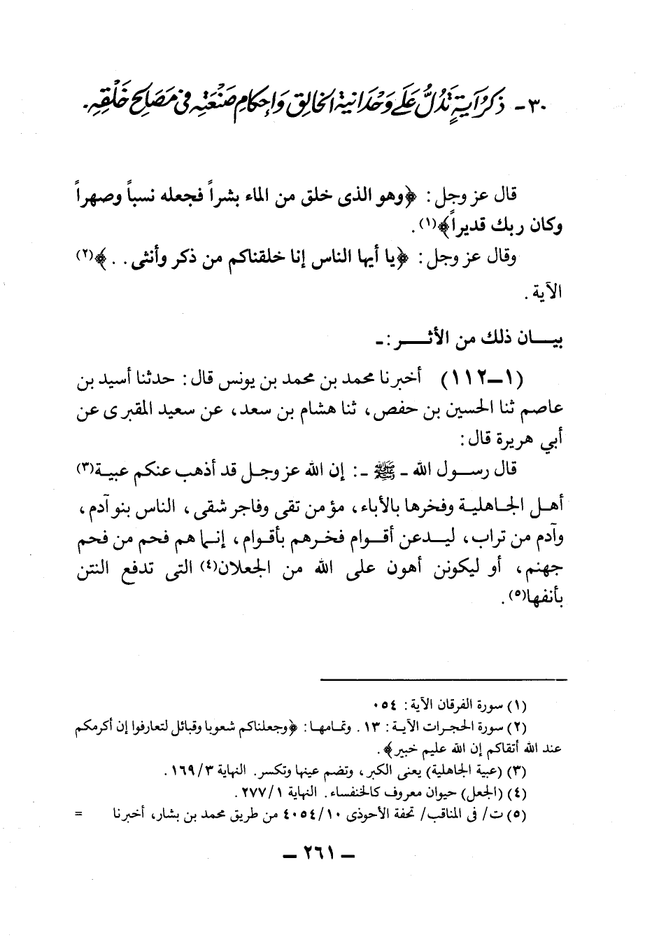 ١١٢ - أَخْبَرَنَا مُحَمَّدُ بْنُ مُحَمَّدِ بْنِ يُونُسَ، قَالَ: حَدثنا أُسَيْدُ بْنُ عَاصِمٍ، حَدثنا الحُسَيْنُ بْنُ حَفْصٍ، حَدثنا هِشَامُ بْنُ سَعْدٍ، عَنْ سَعِيدٍ المَقْبُرِيِّ، عَنْ أَبِي هُرَيْرَةَ قَالَ: قَالَ رَسُولُ الله صَلى الله عَليه وسَلم: إِنَّ الله عَزَّ وَجَلَّ، قَدْ أَذْهَبَ عَنْكُمْ عُبِّيَّةَ أَهْلِ الجَاهِلِيَّةِ وَفَخْرَهَا بِالآبَاءِ، مُؤْمِنٌ تَقِيٌّ، وَفَاجِرٌ شَقِيٌّ، النَّاسُ بَنُو آدَمَ، وَآدَمُ مِنْ تُرَابٍ، ليَدَعَنَّ أَقْوَامٌ فَخْرَهُمْ بِأَقْوَامٍ، إِنَّمَا هُمْ فَحْمٌ مِنْ فَحْمِ جَهَنَّمَ، أَوْ ليَكُونُنَّ أَهْوَنَ عَلَى الله مِنَ الجِعْلَانِ الَّتِي تَدْفَعُ النَّتَنَ بِأَنْفِهَا.