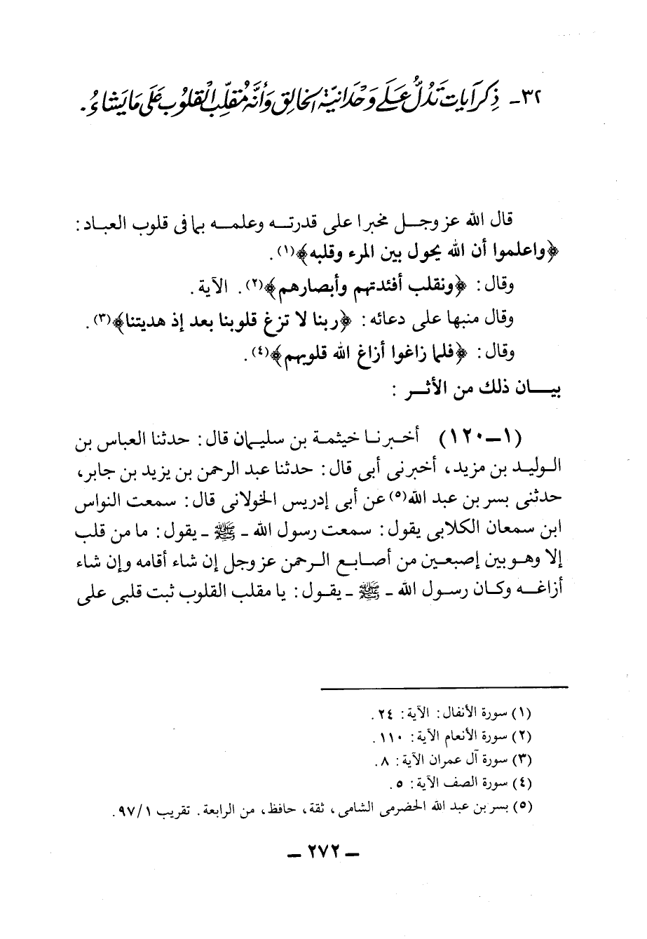 ١٢٠ - أَخْبَرَنَا خَيْثَمَةُ بْنُ سُلَيْمَانَ، قَالَ: حَدثنا العَبَّاسُ بْنُ الوَلِيدِ بْنِ مَزِيدٍ، أَخْبَرَنِي أَبِي، قَالَ: حَدثنا عَبْدُ الرَّحْمَنِ بْنُ يَزِيدَ بْنِ جَابِرٍ، حَدَّثَنِي بُسْرُ بْنُ عَبْدِ الله [١]، عَنْ أَبِي إِدْرِيسَ الخَوْلَانِيِّ قَالَ: سَمِعْتُ النَّوَّاسَ بْنَ سَمْعَانَ الكِلَابِيَّ يَقُولُ: سَمِعْتُ رَسُولَ الله صَلى الله عَليه وسَلم يَقُولُ: مَا مِنْ قَلْبٍ إِلَاّ وَهُوَ بَيْنَ إِصْبُعَيْنِ مِنْ أَصَابِعِ الرَّحْمَنِ، عَزَّ وَجَلَّ، إِنْ شَاءَ أَقَامَهُ وَإِنْ شَاءَ أَزَاغَهُ، وَكَانَ رَسُولُ الله صَلى الله عَليه وسَلم يَقُولُ: يَا مُقَلِّبَ القُلُوبِ ثَبِّتْ قَلْبِي عَلَى دِينِكَ، وَالمِيزَانُ بِيَدِ الرَّحْمَنِ يَرْفَعُ أَقْوَامًا وَيَضَعُ آخَرِينَ إِلَى يَوْمِ القِيَامَةِ.