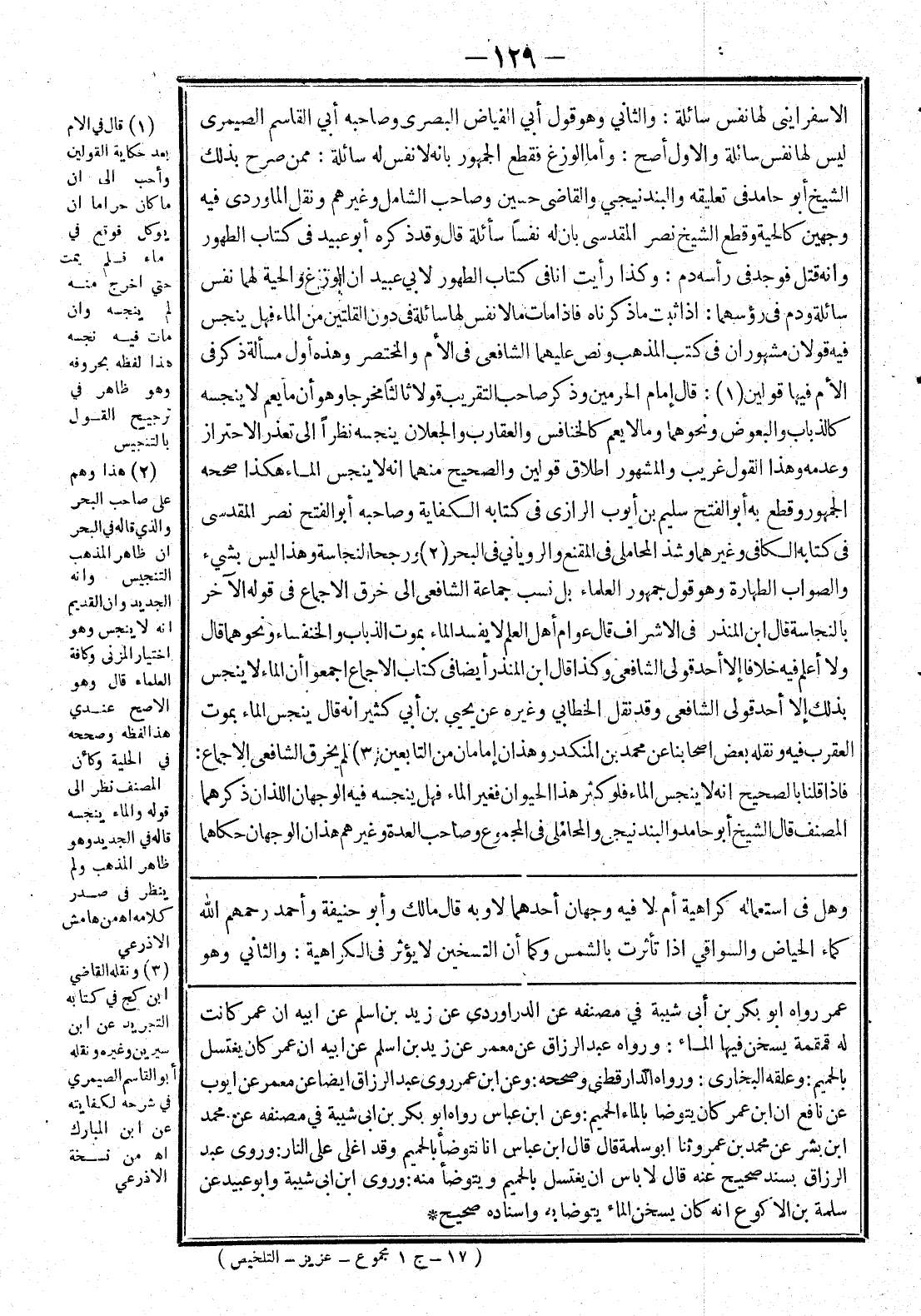 وهل في استعماله كراهية أم لا فيه وجهان أحدهما لا وبه قال مالك وأبو حنيفة وأحمد رحمهم الله كماء الحياض والسواقي إذا تأثرت بالشمس وكما أن التسخين لا يؤثر في الكراهية: والثاني وهو