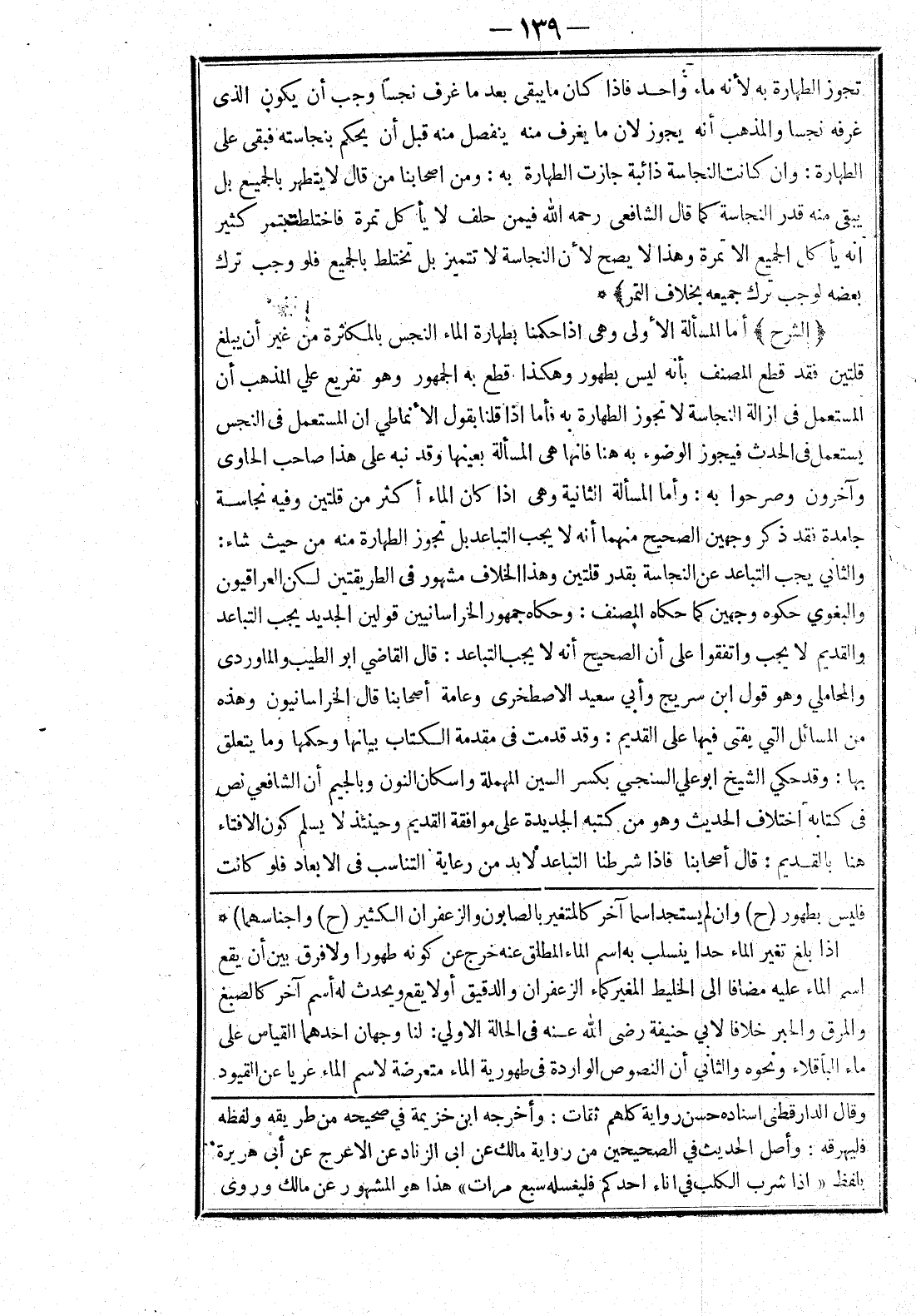فليس بطهور (ح) وان لم يستجد اسما آخر كالمتغير بالصابون والزعفران الكثير (ح) واجناسهما) * إذا بلغ تغير الماء حدا ينسلب به اسم الماء المطلق عنه خرج عن كونه طهورا ولا فرق بين أن يقع اسم الماء عليه مضافا إلى الخليط المغير كماء الزعفران والدقيق أو لا يقع ويحدث له أسم آخر كالصبغ والمرق والحبر خلافا لا بي حنيفة رضى الله عنه في الحالة الاولي: لنا وجهان احدهما القياس على ماء الباقلاء ونحوه والثاني أن النصوص الواردة في طهورية الماء متعرضة لاسم الماء عريا عن القيود