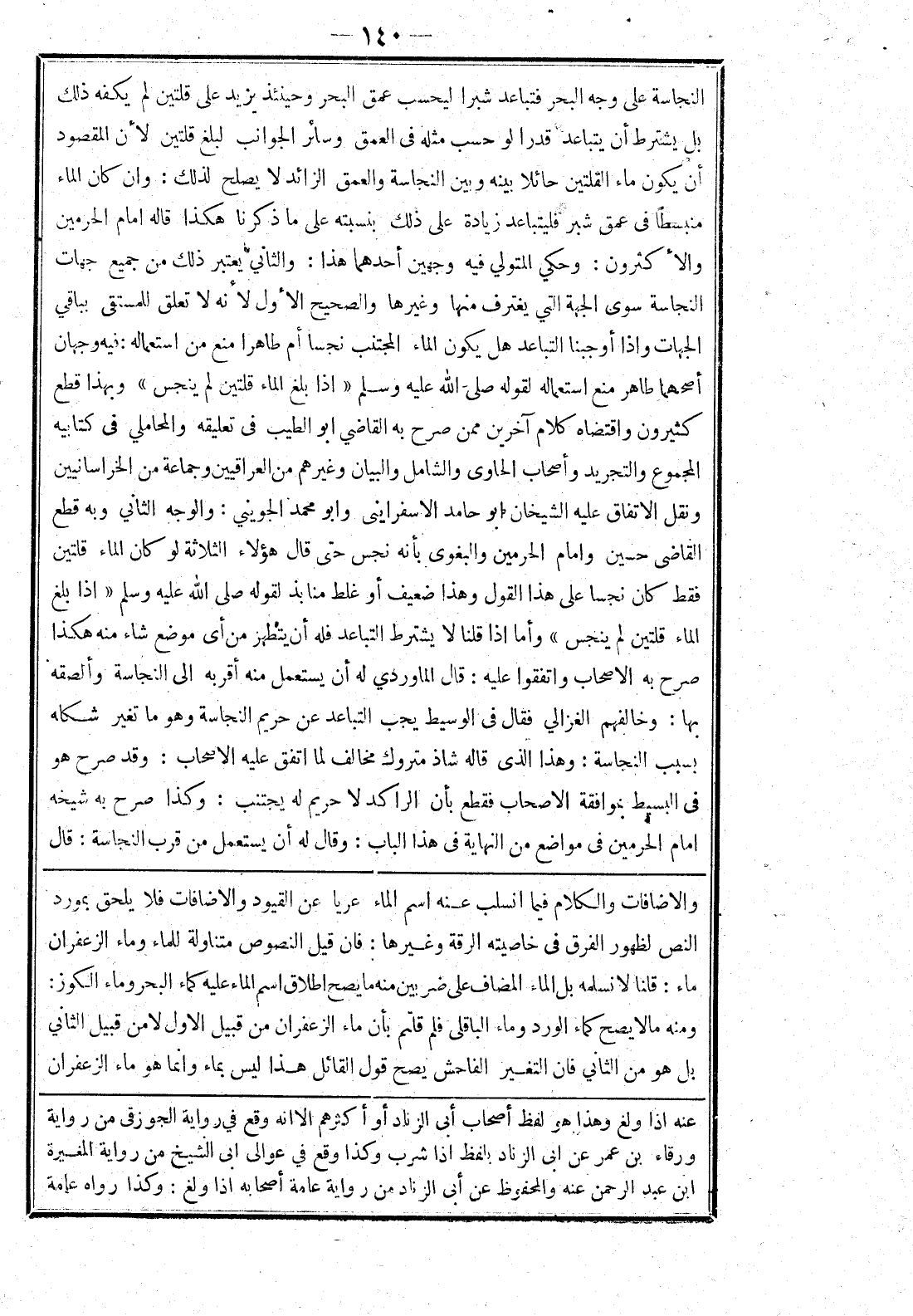 والاضافات والكلام فيما انسلب عنه اسم الماء عريا عن القيود والاضافات فلا يلحق بمورد النص لظهور الفرق في خاصيته الرقة وغيرها: فان قيل النصوص متناولة للماء وماء الزعفران ماء: قلنا لا نسلمه بل الماء المضاف على ضربين منه ما يصح اطلاق اسم الماء عليه كماء البحر وماء الكوز: ومنه ما لا يصح كماء الورد وماء الباقلى فلم قلتم بأن ماء الزعفران من قبيل الاول لا من قبيل الثاني بل هو من الثاني فان التغير الفاحش يصح قول القائل هذا ليس بماء وانما هو ماء الزعفران