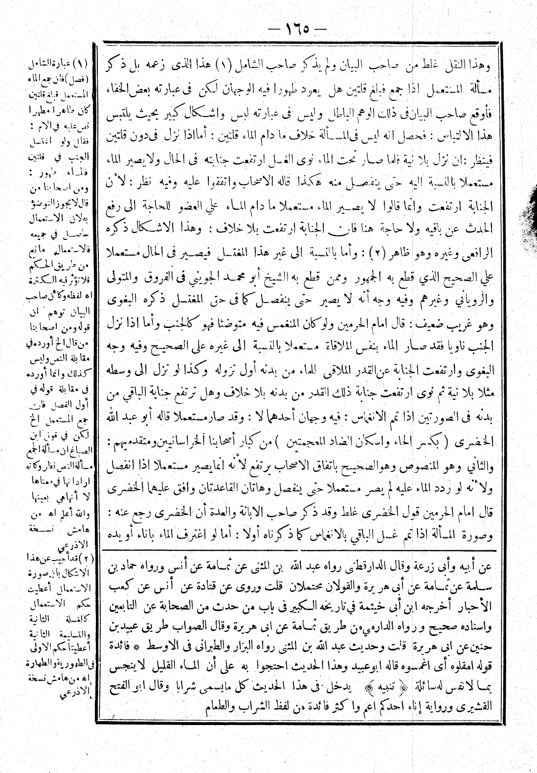 طهور: ومن اصحابنا من قال لا يجوز التوضوء به لان الاستعمال حاصل في جميعه فالاستعمال مانع من طريق الحكم فلا تؤثر فيه الكثرة اه لفظه وكأن صاحب البيان توهم ان قوله ومن اصحابنا من قال الخ اورده في مقابلة النص وليس كذلك وانما اورده في مقابلة قوله في اول الفصل فان جمع المستعمل الخ لكن في قول ابن الصباغ ان مسألة الجمع مسألة النص نظر وكأن اراد انها في معناها لا أنها هي بعينها والله اعلم اه من هامش نسخة الاذرعي (2) قد اجيب عن هذا الاشكال بان صورة الاستعمال اعطيت حكم الاستعمال كالغسلة الثانية والتسليمة الثانية أعطيتا حكم الاولى في الطهورية والطهارة اه من هامش نسخة الاذرعي