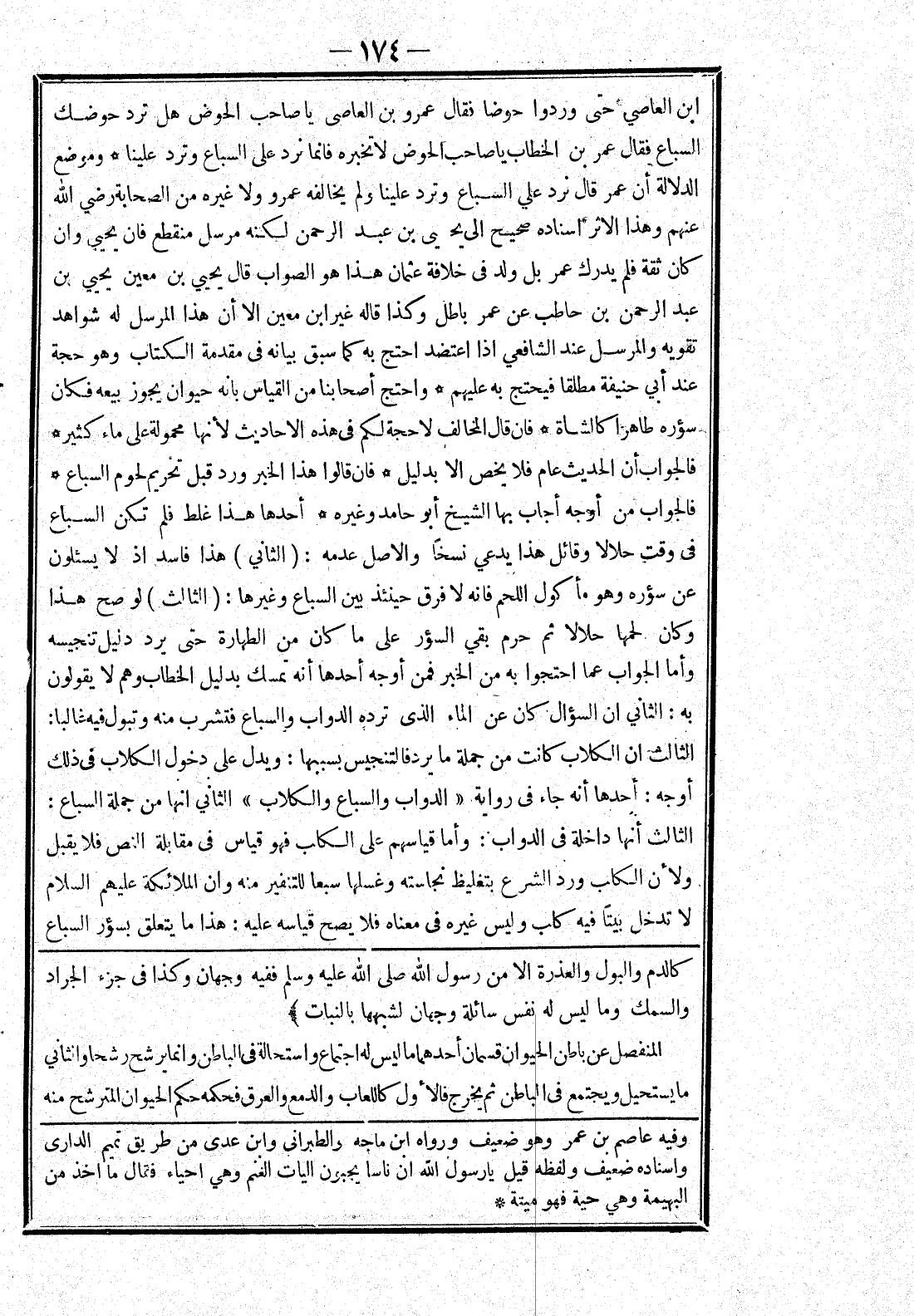 كالدم والبول والعذرة الا من رسول الله صلى الله عليه وسلم ففيه وجهان وكذا في جزء الجراد والسمك وما ليس له نفس سائلة وجهان لشبهها بالنبات) المنفصل عن باطن الحيوان قسمان أحدهما ما ليس له اجتماع واستحالة في الباطن وانما يرشح رشحا والثاني ما يستحيل ويجتمع في الباطن ثم يخرج فالاول كاللعاب والدمع والعرق فحكمه حكم الحيوان المترشح منه