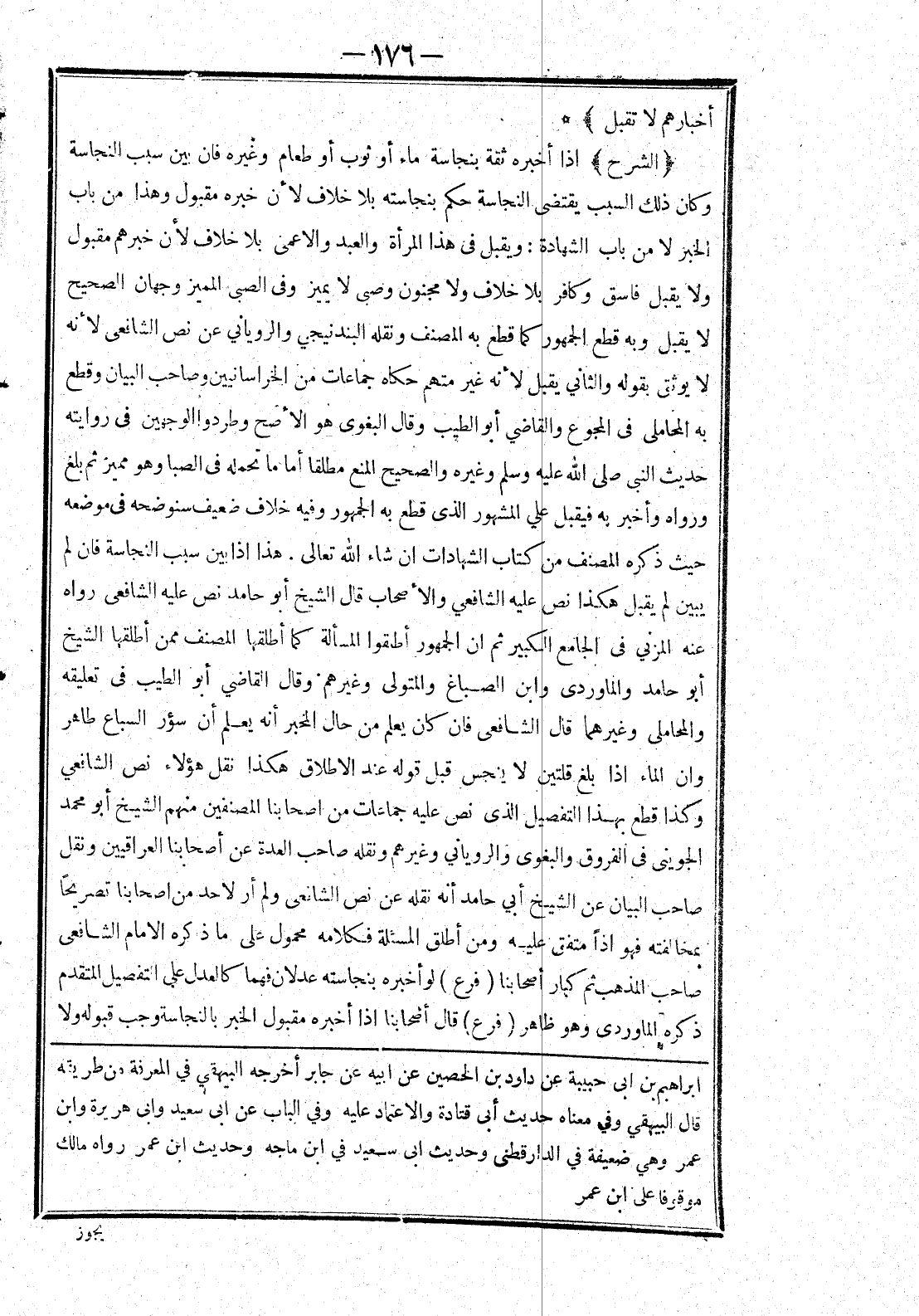 * (الشَّرْحُ) إذَا أَخْبَرَهُ ثِقَةٌ بِنَجَاسَةِ مَاءٍ أَوْ ثَوْبٍ أَوْ طَعَامٍ وَغَيْرِهِ فَإِنْ بَيَّنَ سَبَبَ النَّجَاسَةِ وَكَانَ ذَلِكَ السَّبَبُ يَقْتَضِي النَّجَاسَةَ حُكِمَ بنجاسة بِلَا خِلَافٍ لِأَنَّ خَبَرَهُ مَقْبُولٌ وَهَذَا مِنْ بَابِ الْخَبَرِ لَا مِنْ بَابِ الشَّهَادَةِ: وَيُقْبَلُ فِي هَذَا الْمَرْأَةُ وَالْعَبْدُ وَالْأَعْمَى بِلَا خِلَافٍ لِأَنَّ خَبَرَهُمْ مَقْبُولٌ وَلَا يُقْبَلُ فَاسِقٌ وَكَافِرٌ بِلَا خِلَافٍ وَلَا مَجْنُونٌ وَصَبِيٌّ لَا يُمَيِّزُ وَفِي الصَّبِيِّ الْمُمَيِّزِ وَجْهَانِ الصَّحِيحُ لَا يُقْبَلُ وَبِهِ قَطَعَ الْجُمْهُورُ كَمَا قَطَعَ بِهِ الْمُصَنِّفُ ونقله البند نيجي وَالرُّويَانِيُّ عَنْ نَصِّ الشَّافِعِيِّ لِأَنَّهُ لَا يُوثَقُ بِقَوْلِهِ وَالثَّانِي يُقْبَلُ لِأَنَّهُ غَيْرُ مُتَّهَمٍ حَكَاهُ جَمَاعَاتٌ مِنْ الْخُرَاسَانِيِّينَ وَصَاحِبُ الْبَيَانِ وَقَطَعَ بِهِ الْمَحَامِلِيُّ فِي الْمَجْمُوعِ وَالْقَاضِي أَبُو الطَّيِّبِ وَقَالَ الْبَغَوِيّ هُوَ الْأَصَحُّ وَطَرَدُوا الْوَجْهَيْنِ فِي رِوَايَتِهِ حَدِيثَ النَّبِيِّ صَلَّى اللَّهُ عَلَيْهِ وَسَلَّمَ وَغَيْرِهِ وَالصَّحِيحُ الْمَنْعُ مُطْلَقًا أَمَّا مَا تَحَمَّلَهُ فِي الصِّبَا وَهُوَ مُمَيِّزٌ ثُمَّ بَلَغَ