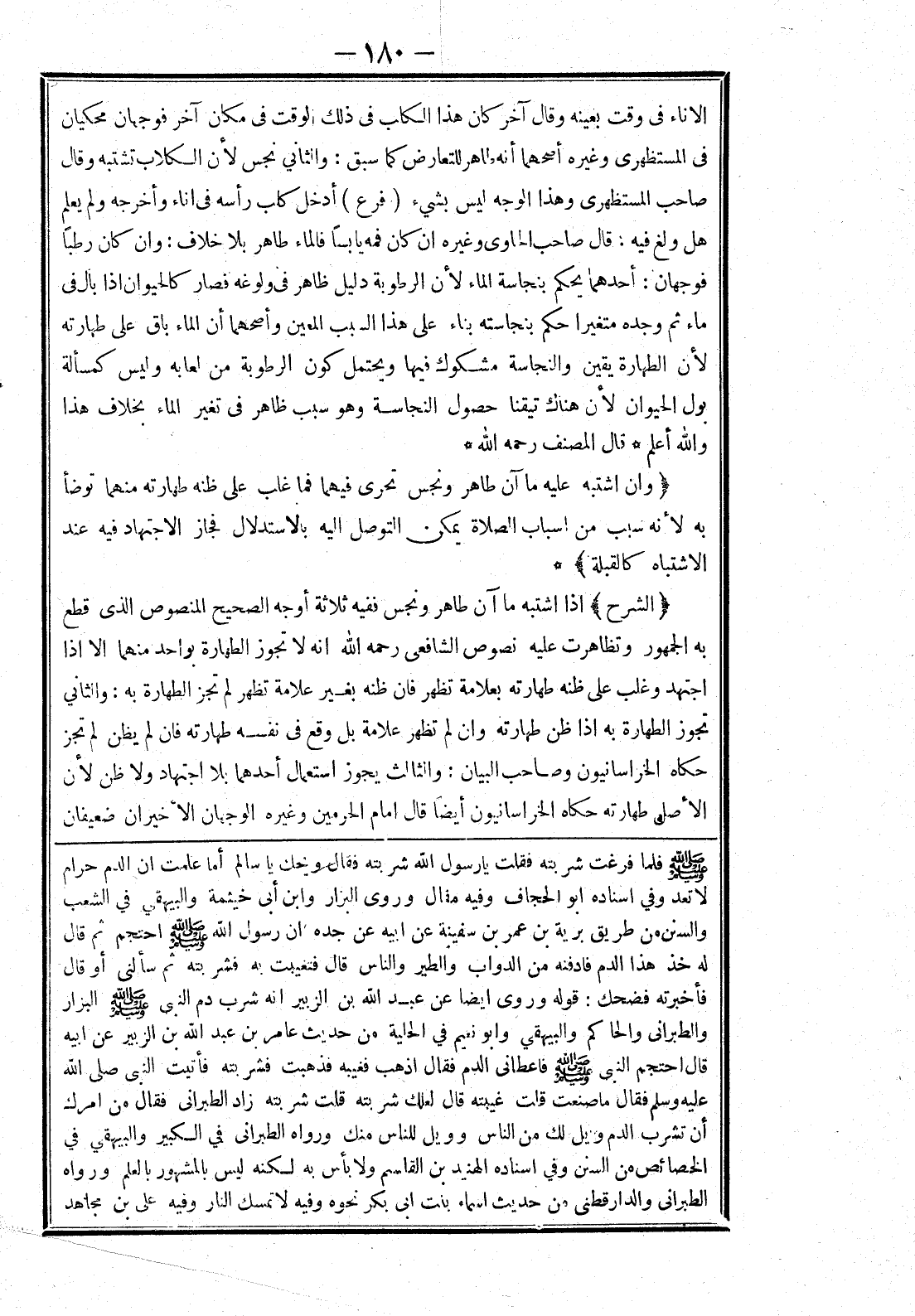 * (الشرح) إذا اشتبه ما أن طَاهِرٌ وَنَجِسٌ فَفِيهِ ثَلَاثَةُ أَوْجُهٍ الصَّحِيحُ الْمَنْصُوصُ الَّذِي قَطَعَ بِهِ الْجُمْهُورُ وَتَظَاهَرَتْ عَلَيْهِ نُصُوصُ الشَّافِعِيِّ رَحِمَهُ اللَّهُ أَنَّهُ لَا تَجُوزُ الطَّهَارَةُ بِوَاحِدٍ مِنْهُمَا إلَّا إذَا اجْتَهَدَ وَغَلَبَ عَلَى ظَنِّهِ طَهَارَتُهُ بِعَلَامَةٍ تَظْهَرُ فَإِنْ ظَنَّهُ بِغَيْرِ عَلَامَةٍ تَظْهَرُ لَمْ تَجُزْ الطَّهَارَةُ بِهِ: وَالثَّانِي تَجُوزُ الطَّهَارَةُ بِهِ إذَا ظَنَّ طَهَارَتَهُ وَإِنْ لَمْ تَظْهَرْ عَلَامَةٌ بَلْ وَقَعَ فِي نَفْسِهِ طَهَارَتُهُ فَإِنْ لَمْ يَظُنَّ لَمْ تَجُزْ حَكَاهُ الْخُرَاسَانِيُّونَ وَصَاحِبُ الْبَيَانِ: وَالثَّالِثُ يَجُوزُ اسْتِعْمَالُ أَحَدِهِمَا بِلَا اجْتِهَادٍ وَلَا ظَنٍّ لِأَنَّ الْأَصْلَ طَهَارَتُهُ حَكَاهُ الْخُرَاسَانِيُّونَ أَيْضًا قَالَ إمَامُ الْحَرَمَيْنِ وَغَيْرُهُ الْوَجْهَانِ الْأَخِيرَانِ ضَعِيفَانِ