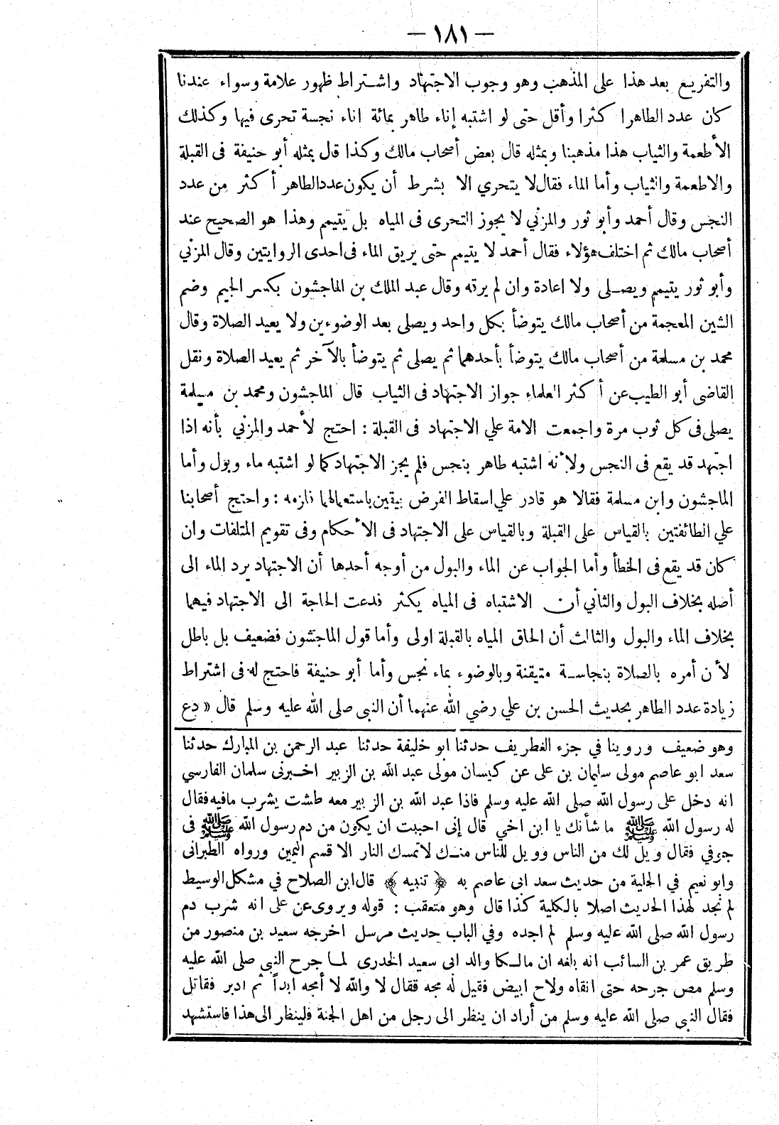 الْمَاجِشُونُ وابن مسلمة فَقَالَا هُوَ قَادِرٌ عَلَى إسْقَاطِ الْفَرْضِ بِيَقِينٍ بِاسْتِعْمَالِهِمَا فَلَزِمَهُ: وَاحْتَجَّ أَصْحَابُنَا عَلَى الطَّائِفَتَيْنِ بِالْقِيَاسِ عَلَى الْقِبْلَةِ وَبِالْقِيَاسِ عَلَى الِاجْتِهَادِ فِي الْأَحْكَامِ وَفِي تَقْوِيمِ الْمُتْلَفَاتِ وَإِنْ كَانَ قَدْ يَقَعُ فِي الْخَطَأِ وَأَمَّا الْجَوَابُ عَنْ الْمَاءِ وَالْبَوْلِ مِنْ أَوْجُهٍ أَحَدُهَا أَنَّ الِاجْتِهَادَ يَرُدُّ الْمَاءَ إلَى أَصْلِهِ بِخِلَافِ الْبَوْلِ وَالثَّانِي أَنَّ الِاشْتِبَاهَ في المياه يَكْثُرُ فَدَعَتْ الْحَاجَةُ إلَى الِاجْتِهَادِ فِيهِمَا بِخِلَافِ الْمَاءِ وَالْبَوْلِ وَالثَّالِثُ أَنَّ إلْحَاقَ الْمِيَاهِ بِالْقِبْلَةِ اولى وأما قول الْمَاجِشُونِ فَضَعِيفٌ بَلْ بَاطِلٌ لِأَنَّ أَمْرَهُ بِالصَّلَاةِ بِنَجَاسَةٍ مُتَيَقَّنَةٍ وَبِالْوُضُوءِ بِمَاءٍ نَجِسٍ وَأَمَّا أَبُو حَنِيفَةَ فَاحْتُجَّ لَهُ فِي اشْتِرَاطِ زِيَادَةِ عَدَدِ الطَّاهِرِ بِحَدِيثِ الْحَسَنِ بْنِ عَلِيٍّ رَضِيَ اللَّهُ عَنْهُمَا أَنَّ النَّبِيَّ صَلَّى اللَّهُ عَلَيْهِ وَسَلَّمَ قَالَ دع