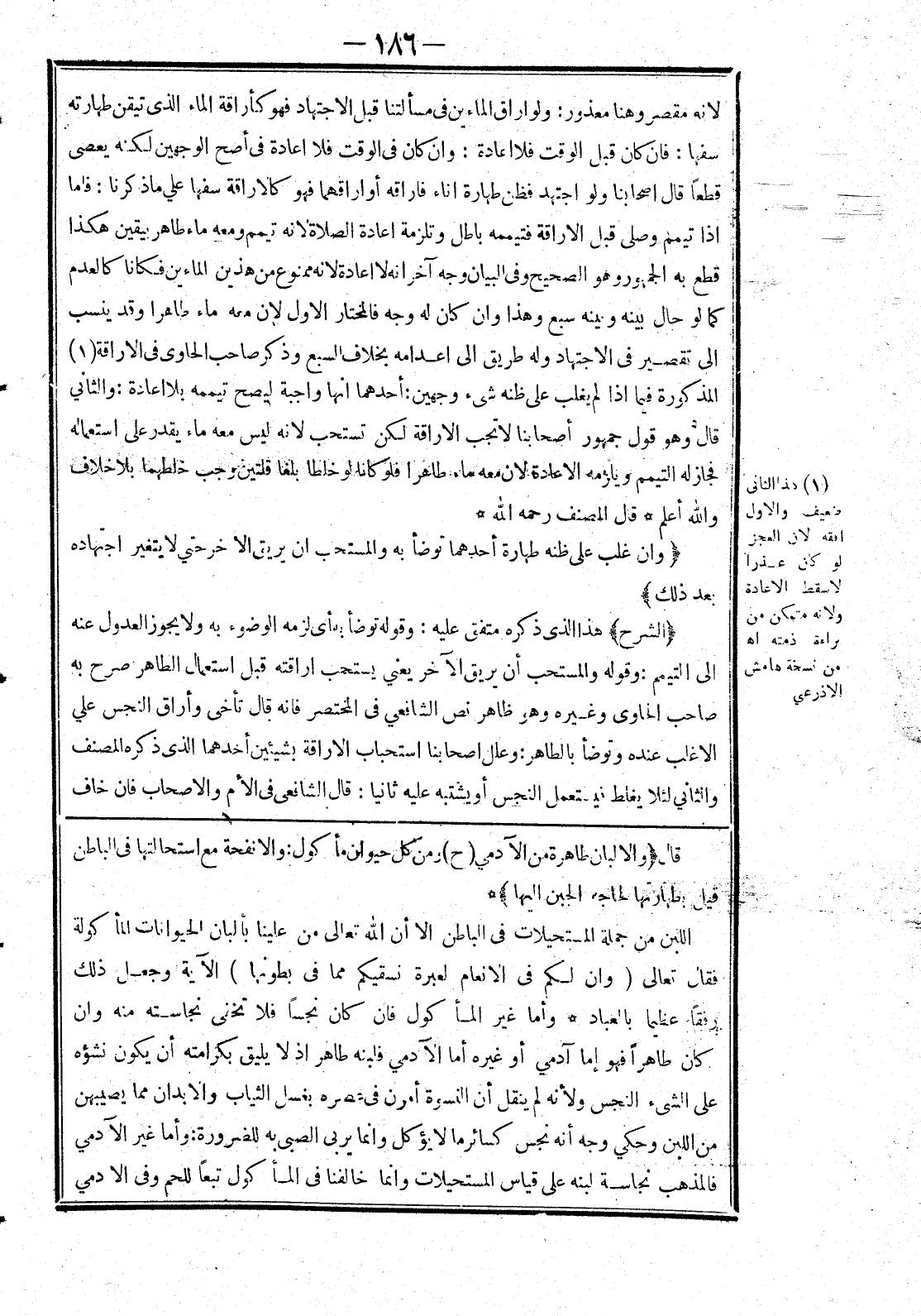 قال (والالبان طاهرة من الآدمي (ح) ومن كل حيوان مأكول: والانفحة مع استحالتها في الباطن قيل بطهارتها لحاجه الجبن إليها) * اللبن من جملة المستحيلات في الباطن الا أن الله تعالى من علينا بألبان الحيوانات المأكولة فقال تعالى (وان لكم في الانعام لعبرة نسقيكم مما في بطونها) الآية وجعل ذلك رفقا عظيما بالعباد * وأما غير المأكول فان كان نجسا فلا تخفى نجاسته منه وان كان طاهرا فهو إما آدمي أو غيره أما الآدمي فلبنه طاهر إذ لا يليق بكرامته أن يكون نشؤه على الشئ النجس ولانه لم ينقل أن النسوة أمرن في عصره بغسل الثياب والا بدان مما يصيبهن من اللبن وحكي وجه أنه نجس كسائر ما لا يؤكل وانما يربى الصبى به لضرورة: وأما غير الآدمي فالمذهب نجاسة لبنه على قياس المستحيلات وانما خالفنا في المأكول تبعا للحم وفي الادمي