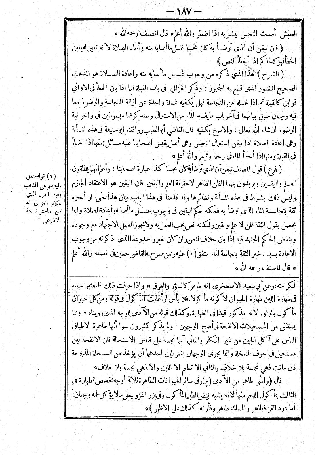 وكذلك قوله من الآدمى للوجه الذى رويناه * ومما يستثنى من المستحيلات الانفحة في أصح الوجهين: ولم يذكر كثيرون سوا أنها طاهرة لاطباق الناس على أكل الجبن من غير انكار والثاني أنها نجسة على قياس الاستحالة فان الانفحة لبن مستحيل في جوف السخلة وانما يجرى الوجهان بشرطين احدهما أن يؤخذ من السخلة المذبوحة فان ماتت فهي نجسة بلا خلاف والثاني الا تطعم الا اللبن والا فهي نجسة بلا خلاف * قال (والمنى طاهر من الآدمى (م) وفي سائر الحيوانات الطاهرة ثلاثة أوجه تخصص الطهارة في الثالث بمأكول اللحم منها لانه يشبه بيض الطير المأكول وفي بزر القز وبيض ما لا يؤكل لحمه وجهان: