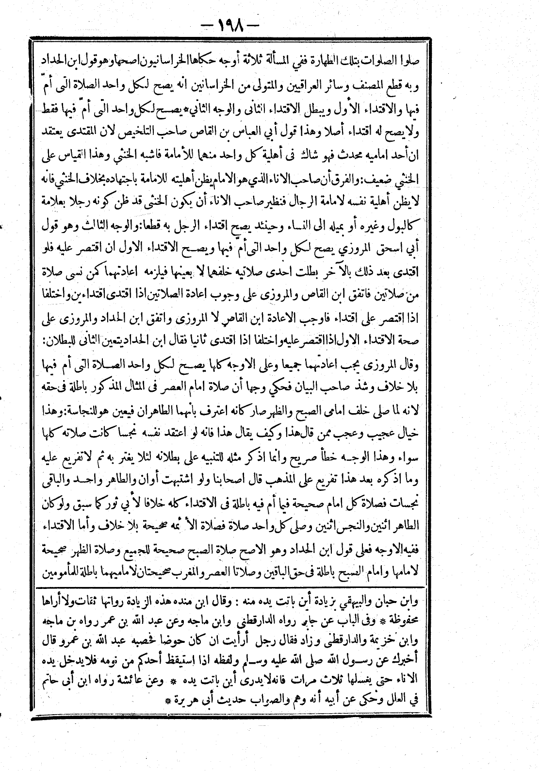 * يَصِحُّ لِكُلِّ وَاحِدٍ الَّتِي أَمَّ فِيهَا فَقَطْ وَلَا يَصِحُّ لَهُ اقْتِدَاءٌ أَصْلًا وَهَذَا قَوْلُ أَبِي الْعَبَّاسِ بْنِ الْقَاصِّ صَاحِبِ التَّلْخِيصِ لِأَنَّ الْمُقْتَدِيَ يَعْتَقِدُ أَنَّ أَحَدَ إمَامَيْهِ مُحْدِثُ فَهُوَ شَاكٌّ فِي أَهْلِيَّةِ كُلِّ وَاحِدٍ مِنْهُمَا لِلْإِمَامَةِ فَأَشْبَهَ الْخُنْثَى وَهَذَا الْقِيَاسُ عَلَى الْخُنْثَى ضَعِيفٌ: وَالْفَرْقُ أَنَّ صَاحِبَ الْإِنَاءِ الَّذِي هُوَ الامام يظن اهليته للامامتة بِاجْتِهَادِهِ بِخِلَافِ الْخُنْثَى فَإِنَّهُ لَا يَظُنُّ أَهْلِيَّةَ نَفْسِهِ لِإِمَامَةِ الرِّجَالِ فَنَظِيرُ صَاحِبِ الْإِنَاءِ أَنْ يَكُونَ الْخُنْثَى قَدْ ظَنَّ كَوْنَهُ رَجُلًا بِعَلَامَةٍ كَالْبَوْلِ وَغَيْرِهِ أَوْ بِمَيْلِهِ إلَى النِّسَاءِ وَحِينَئِذٍ يَصِحُّ اقْتِدَاءُ الرَّجُلِ بِهِ قَطْعًا: وَالْوَجْهُ الثَّالِثُ وهو قول أبي اسحق المروزي يصح لِكُلِّ وَاحِدٍ الَّتِي أَمَّ فِيهَا وَيَصِحُّ الِاقْتِدَاءُ الْأَوَّلُ إنْ اقْتَصَرَ عَلَيْهِ فَلَوْ اقْتَدَى بَعْدَ ذَلِكَ بِالْآخَرِ بَطَلَتْ إحْدَى صَلَاتَيْهِ خَلْفَهُمَا لَا بِعَيْنِهَا فَيَلْزَمُهُ إعَادَتُهُمَا كَمَنْ نَسِيَ صَلَاةً مِنْ صَلَاتَيْنِ فَاتَّفَقَ ابْنُ الْقَاصِّ وَالْمَرْوَزِيُّ عَلَى وُجُوبِ إعَادَةِ الصَّلَاتَيْنِ إذَا اقْتَدَى اقْتِدَاءَيْنِ وَاخْتَلَفَا إذَا اقْتَصَرَ عَلَى اقْتِدَاءٍ فَأَوْجَبَ الْإِعَادَةَ ابْنُ الْقَاصِّ لَا الْمَرْوَزِيُّ وَاتَّفَقَ ابْنُ الْحَدَّادِ وَالْمَرْوَزِيُّ عَلَى صِحَّةِ الِاقْتِدَاءِ الْأَوَّلِ إذَا اقْتَصَرَ عَلَيْهِ وَاخْتَلَفَا إذَا اقْتَدَى ثَانِيًا فَقَالَ ابْنُ الْحَدَّادِ يَتَعَيَّنُ الثَّانِي لِلْبُطْلَانِ: وَقَالَ الْمَرْوَزِيُّ يَجِبُ إعَادَتُهُمَا جَمِيعًا وَعَلَى الْأَوْجُهِ كُلِّهَا يَصِحُّ لِكُلِّ وَاحِدٍ الصَّلَاةُ الَّتِي أَمَّ فِيهَا بِلَا خِلَافٍ وَشَذَّ صَاحِبُ الْبَيَانِ فَحَكَى وَجْهًا أَنَّ صَلَاةَ إمَامِ الْعَصْرِ فِي الْمِثَالِ الْمَذْكُورِ بَاطِلَةٌ فِي حَقِّهِ لِأَنَّهُ لَمَّا صَلَّى خَلْفَ إمَامَيْ الصُّبْحِ وَالظُّهْرِ صَارَ كانه اعترف بانهما الطاهران فيعين هُوَ لِلنَّجَاسَةِ: وَهَذَا خَيَالٌ عَجِيبٌ وَعَجَبٌ مِمَّنْ قَالَ هَذَا وَكَيْفَ يُقَالُ هَذَا فَإِنَّهُ لَوْ اعْتَقَدَ نَفْسَهُ نَجِسًا كَانَتْ صَلَاتُهُ كُلُّهَا سَوَاءً وهذا الوجه خطأ صريح وانما أَذْكُرُ مِثْلَهُ لِلتَّنْبِيهِ عَلَى بُطْلَانِهِ لِئَلَّا يُغْتَرَّ بِهِ ثُمَّ لَا تَفْرِيعَ عَلَيْهِ وَمَا أَذْكُرُهُ بَعْدَ هَذَا تَفْرِيعٌ عَلَى الْمَذْهَبِ قَالَ أَصْحَابُنَا ولو اشتبهت أو ان وَالطَّاهِرُ وَاحِدٌ وَالْبَاقِي