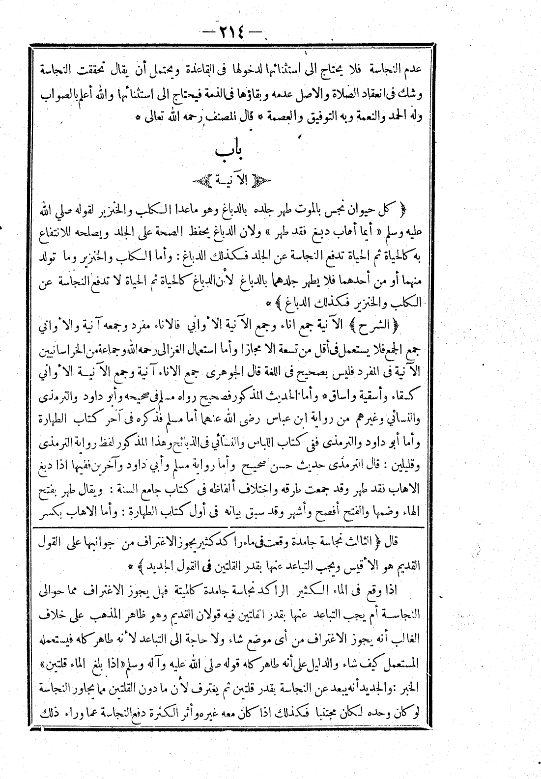 قال (الثالث نجاسة جامدة وقعت في ماء راكد كثير يجوز الاغتراف من جوانبها على القول القديم هو الاقيس ويجب التباعد عنها بقدر القلتين في القول الجديد) إذا وقع في الماء الكثير الراكد نجاسة جامدة كالميتة فهل يجوز الاغتراف مما حوالى النجاسة أم يجب التباعد عنها بقدر القلتين فيه قولان القديم وهو ظاهر المذهب على خلاف الغالب أنه يجوز الاغتراف من أي موضع شاء ولا حاجة إلى التباعد لانه طاهر كله فيستعمله المستعمل كيف شاء والدليل على أنه طاهر كله قوله صلى الله عليه وسلم إذا بلغ الماء قلتين الخبر: والجديد أنه يبعد عن النجاسة بقدر قلتين ثم يغترف لان ما دون القلتين مما يجاور النجاسة لو كان وحده لكان مجتنبا فكذلك إذا كان معه غيره وأثر الكثيرة دفع النجاسة عما وراء ذلك
