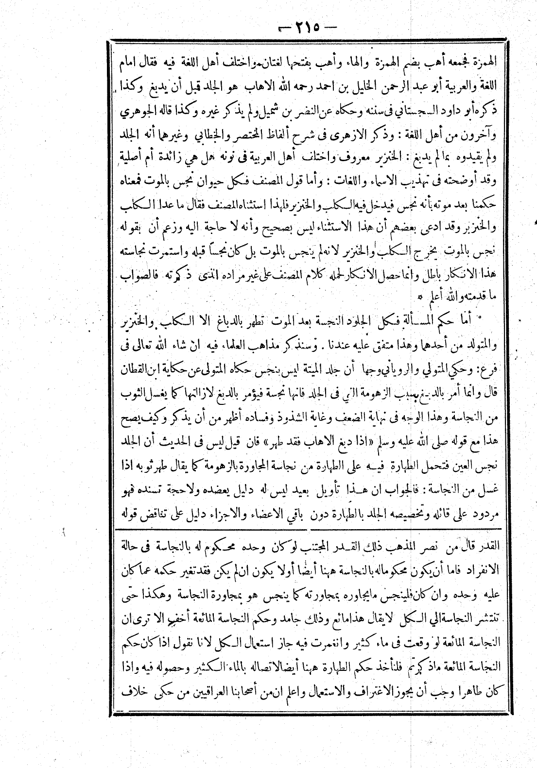 عليه وحده وان كان فلينجس ما يجاوره بمجاورته كما ينجس هو بمجاورة النجاسة وهكذا حتى تنتشر النجاسة الي الكل لا يقال هذا مائع وذلك جامد وحكم النجاسة المائعة أخف الا ترى ان النجاسة المائعة لو وقعت في ماء كثير وانغمرت فيه جاز استعمال الكل لانا نقول إذا كان حكم النجاسة المائعة ما ذكرتم فلنأخذ حكم الطهارة ههنا أيضا لا تصاله بالملا الكثير وحصوله فيه وإذا كان طاهرا وجب أن يجوز الاغتراف والاستعمال واعلم ان من أصحابنا العراقيين من حكى خلاف