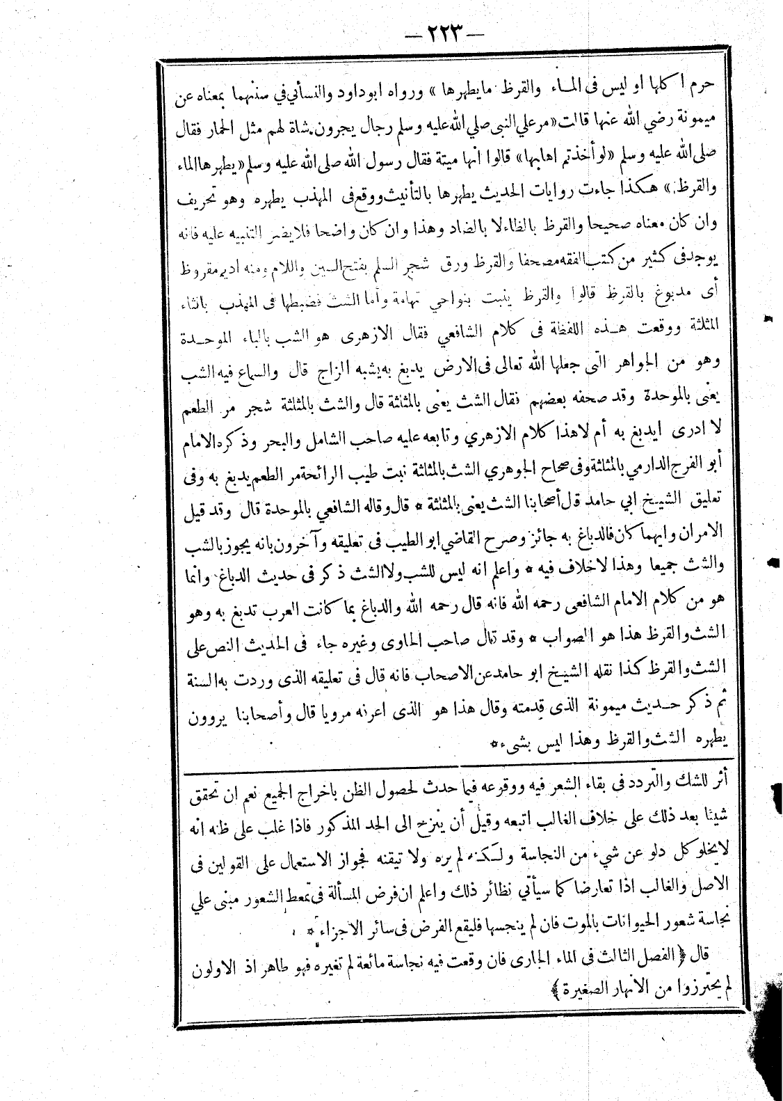 الاصل والغالب إذا تعارضا كما سيأتي نظائر ذلك واعلم ان فرض المسألة في تمعط الشعور مبنى علي نجاسة شعور الحيوانات بالموت فان لم ينجسها فليقع الفرض في سائر الاجزاء * قال (الفصل الثالث في الماء الجارى فان وقعت فيه نجاسة مائعة لم تغيره فهو طاهر إذا الاولون لم يحترزوا من الانهار الصغيرة)